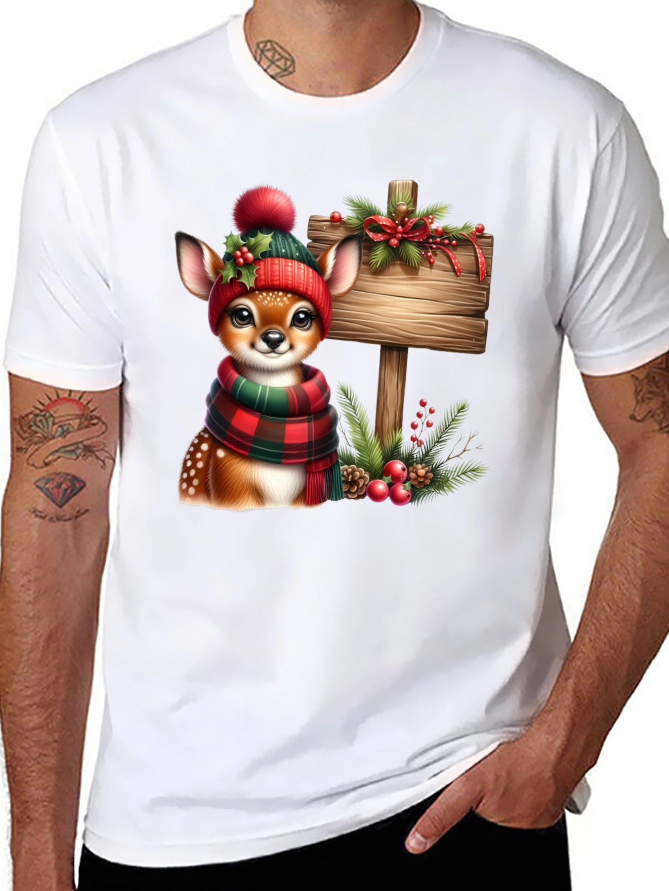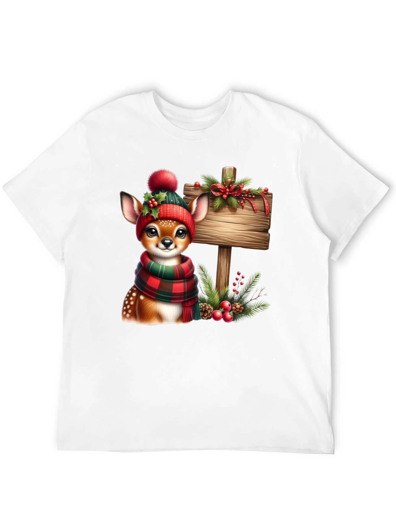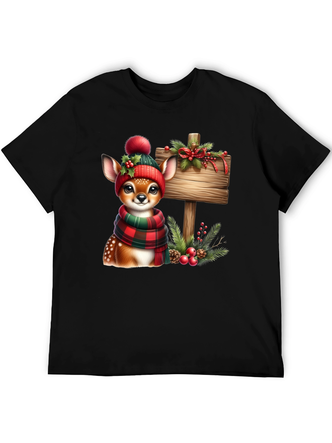 Esta camiseta negra presenta un adorable ciervo de estilo caricaturesco, perfecto para la temporada navideña. El ciervo lleva un gorro rojo y verde con un pompón, además de una bufanda a cuadros que le da un toque festivo y acogedor. Junto al ciervo, hay un letrero de madera decorado con adornos navideños, como ramas de pino, bayas rojas y un lazo. La impresión de alta calidad destaca sobre el fondo negro de la camiseta, creando un contraste llamativo. Ideal para llevar durante las fiestas, para regalar a amantes de los animales, o simplemente para añadir un toque alegre a tu vestuario diario. ¡Perfecta para celebrar la Navidad con estilo!