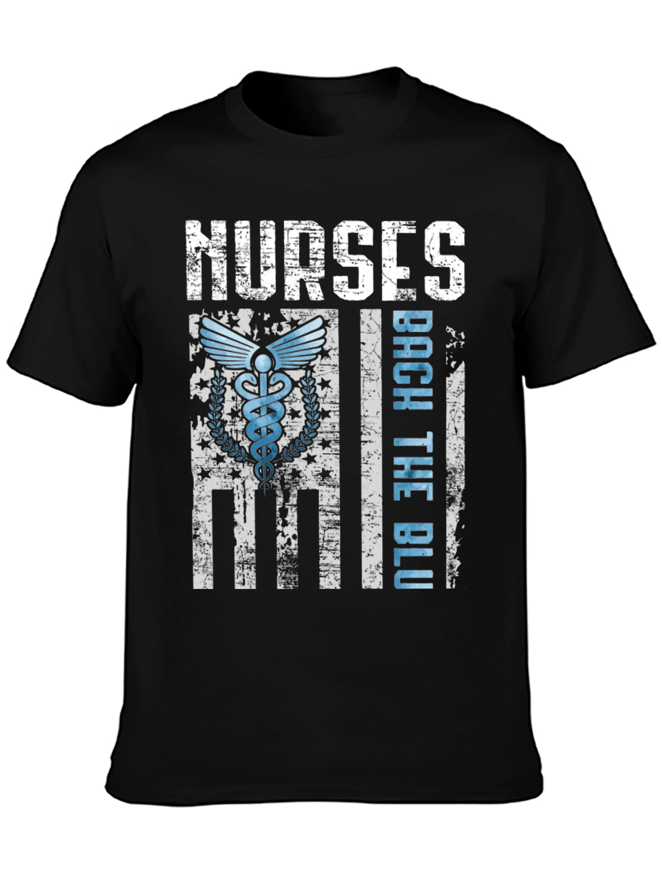 Muestra tu apoyo con esta camiseta negra de enfermeras. Presenta un diseño patriótico con el texto "Nurses Back the Blue" estampado en blanco con un diseño de bandera. Ideal para enfermeras orgullosas y partidarias. El tejido parece ser de algodón suave y cómodo, perfecto para llevarlo a diario. Destaca entre la multitud y muestra tu orgullo por la profesión de enfermería. Perfecta para regalar a esa enfermera especial en tu vida o para lucir con orgullo en tu tiempo libre. ¡Consigue la tuya hoy mismo!