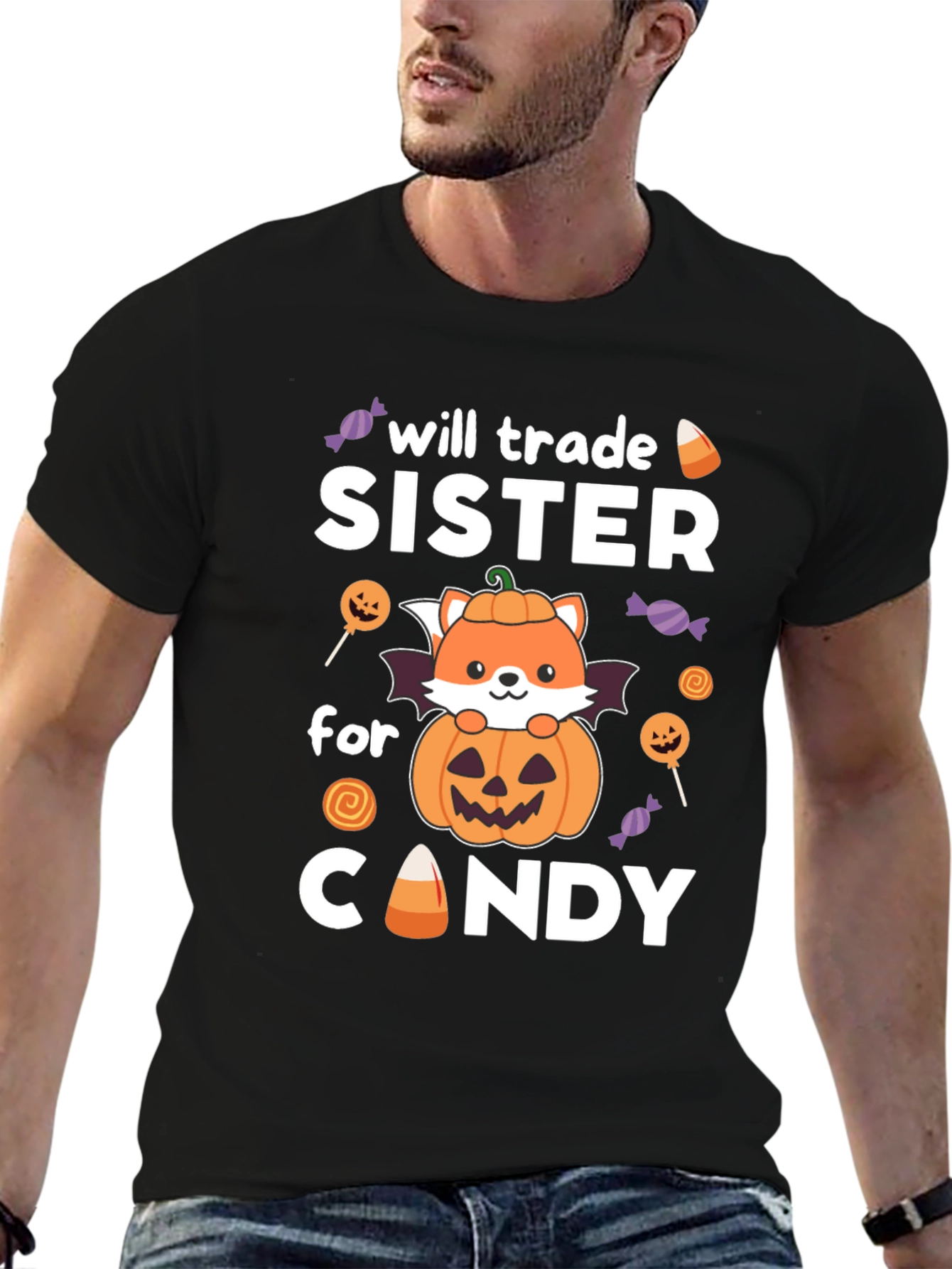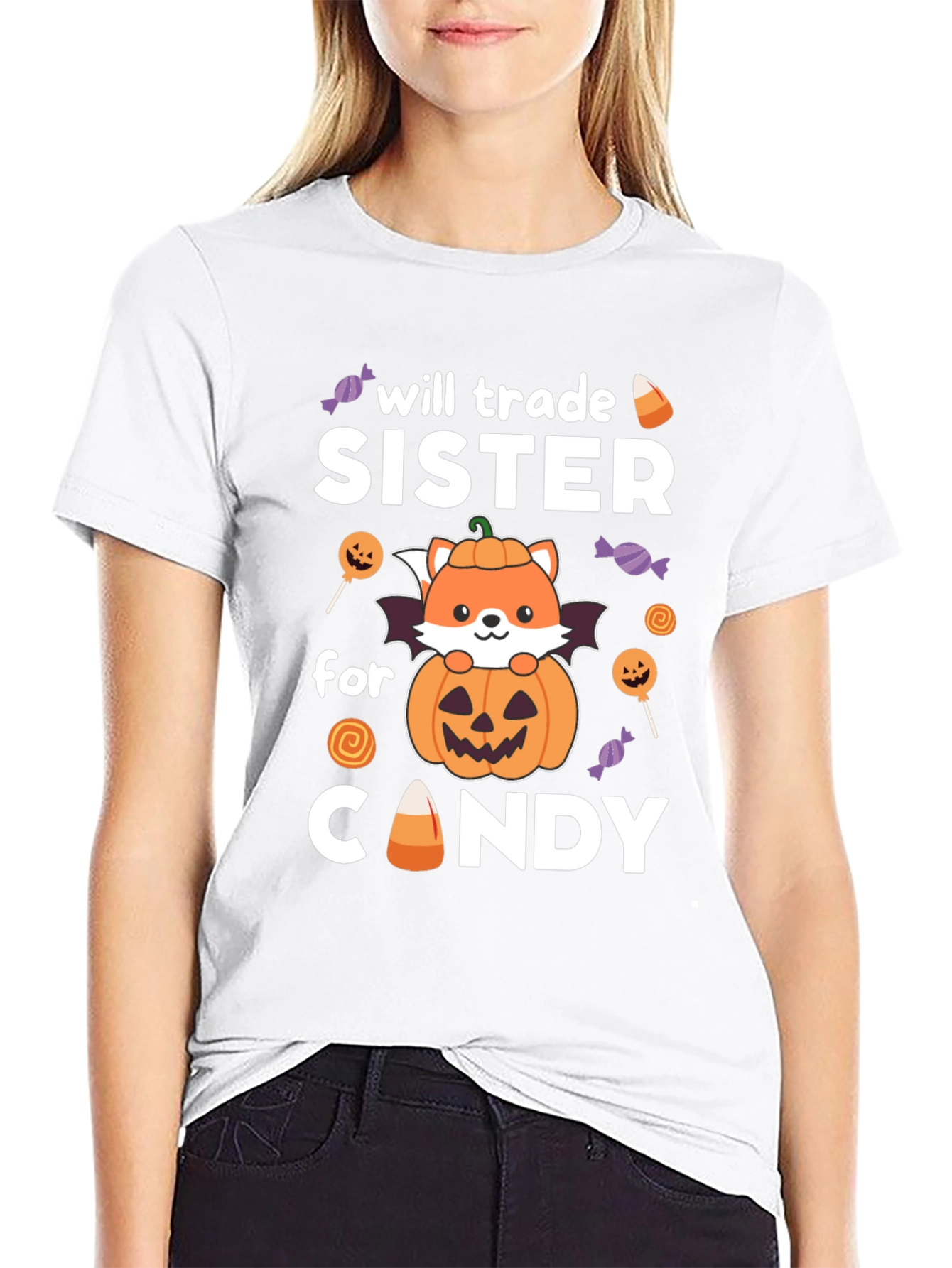 ¡Prepárate para Halloween con esta divertida camiseta! Muestra un diseño llamativo con la frase "Will trade sister for Candy" (Cambio hermana por dulces), ideal para los amantes de esta festividad. La camiseta negra presenta gráficos de dulces y un adorable zorro con alas de murciélago dentro de una calabaza. Es perfecta para llevar en fiestas de Halloween, pedir dulces o simplemente para mostrar tu espíritu festivo. Fabricada con materiales suaves y cómodos, esta camiseta es una opción divertida y original para celebrar Halloween con estilo. ¡Consigue la tuya y destaca en la noche más terrorífica del año!