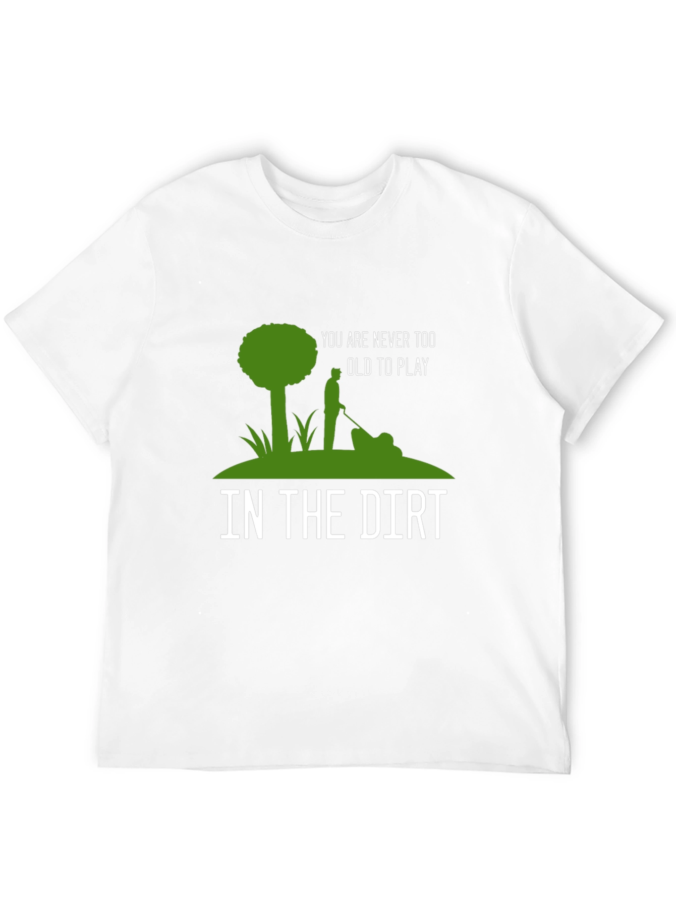Esta camiseta negra de hombre presenta un diseño divertido y relajante para los amantes de la jardinería. En el centro, se observa un gráfico verde que representa un árbol, una persona cortando el césped y la frase "IN THE DIRT", todo sobre una base verde. La frase "YOU ARE NEVER TOO OLD TO PLAY" se encuentra en la parte superior del diseño. Fabricada con materiales suaves y cómodos, es perfecta para usar mientras trabajas en el jardín o simplemente para mostrar tu pasión por la naturaleza. Ideal para regalar a padres, abuelos o cualquier persona que disfrute pasar tiempo al aire libre. ¡Demuestra tu amor por la jardinería con esta original camiseta!