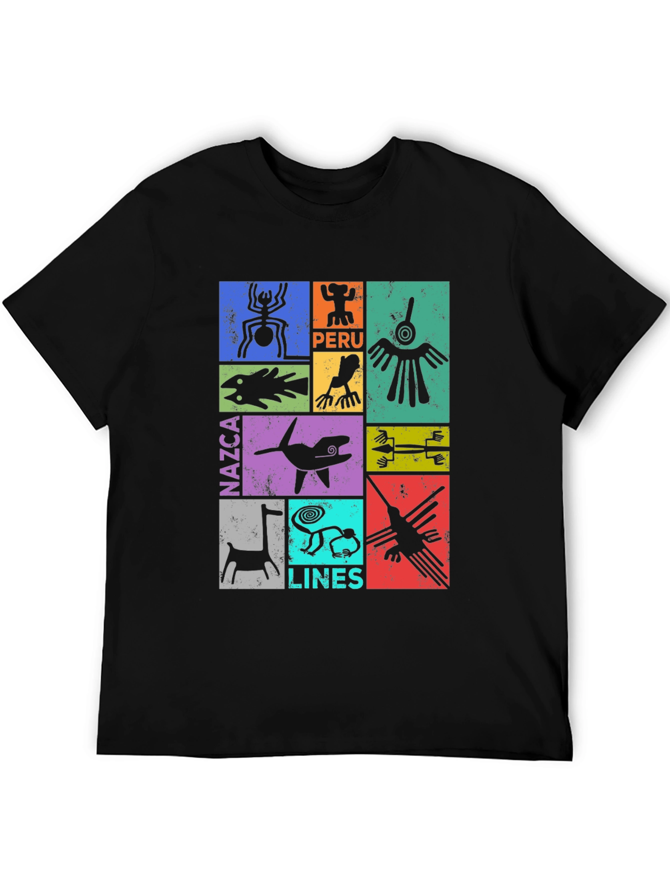 Descubre la camiseta perfecta para los amantes de la cultura peruana. Esta camiseta negra de algodón presenta un diseño vibrante y colorido inspirado en las famosas Líneas de Nazca. Cada símbolo, desde la araña hasta el colibrí, está representado en un estilo gráfico único, con colores brillantes que resaltan sobre el fondo oscuro. Ideal para usar en el día a día, esta camiseta es una excelente forma de mostrar tu aprecio por la historia y el arte del Perú. Su tejido suave y cómodo garantiza un ajuste perfecto, mientras que su diseño llamativo te asegura destacar entre la multitud. ¡Añade un toque de originalidad a tu guardarropa con esta pieza única!
