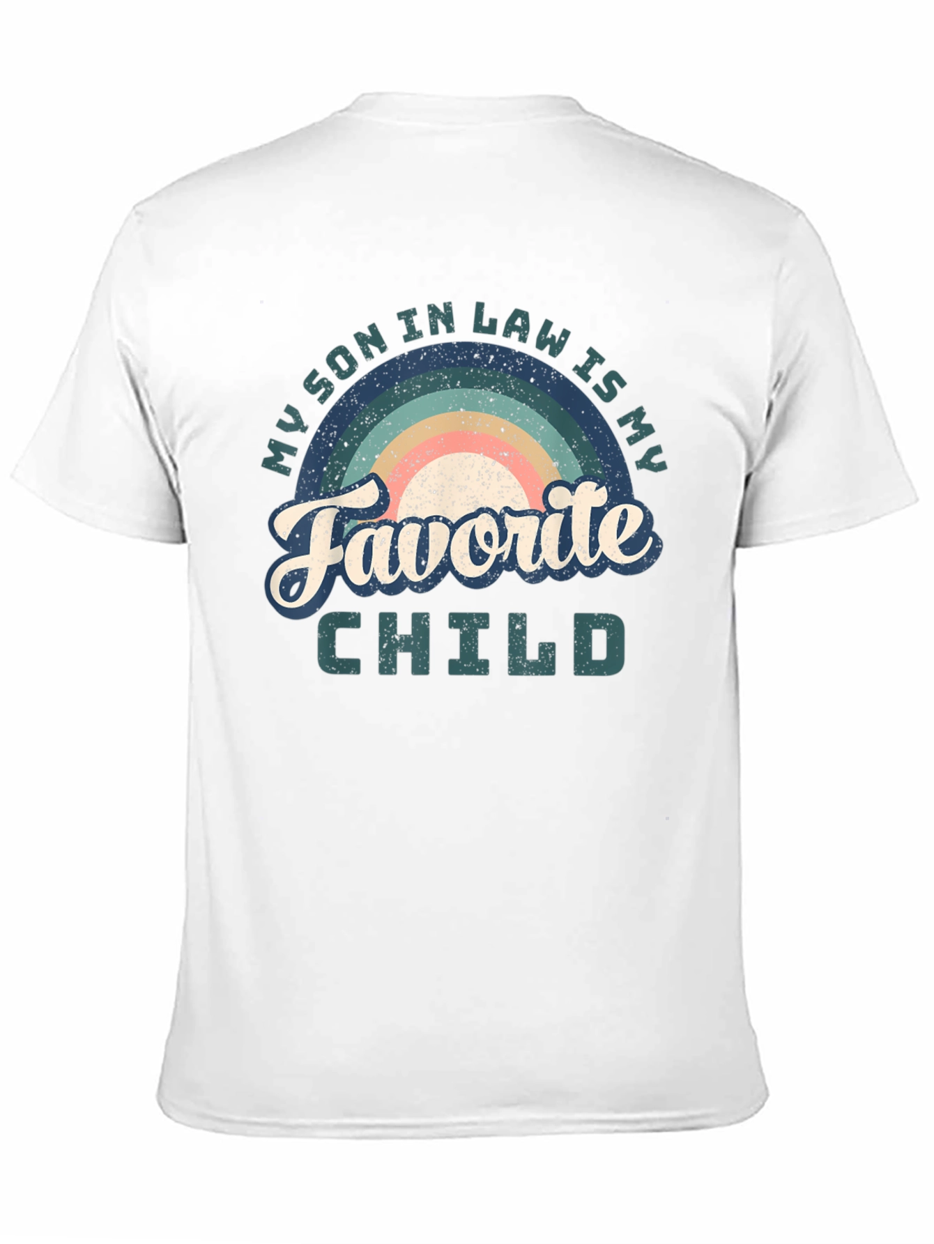 Esta camiseta negra de hombre presenta un diseño divertido y llamativo. Muestra un arcoíris retro con la frase "My son in law is my favorite child" (Mi yerno es mi hijo favorito). Ideal para aquellos que adoran expresar su cariño con un toque de humor. Perfecta para usar en reuniones familiares, salidas casuales o simplemente para relajarse en casa. Su diseño único la convierte en una excelente opción para regalar a ese yerno especial o a un padre orgulloso. Con un estilo cómodo y moderno, esta camiseta seguramente será un éxito.