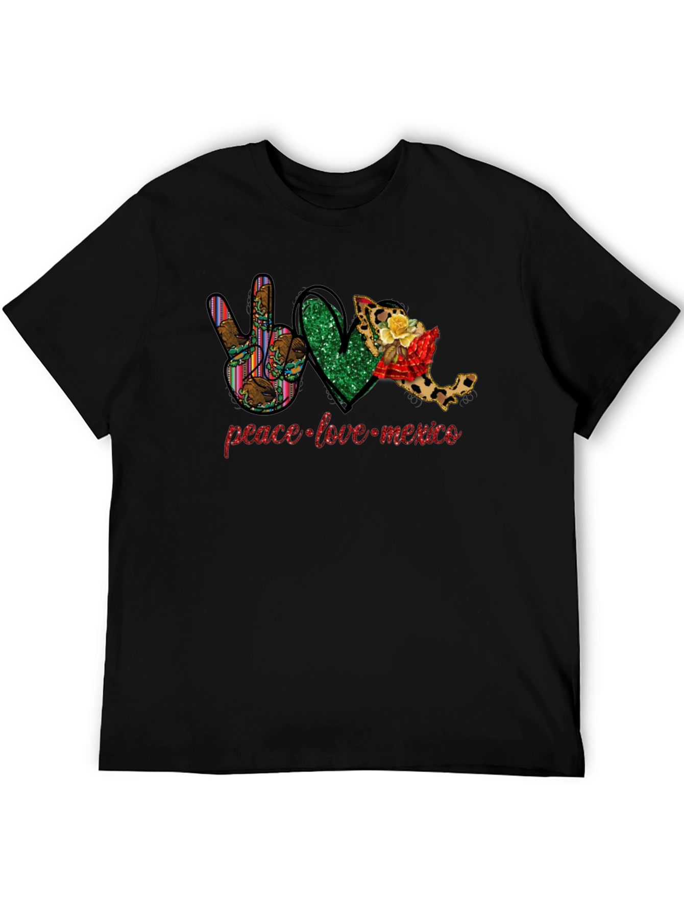¡Celebra tu amor por México con esta camiseta única! El diseño presenta un símbolo de la paz con motivos tradicionales, un corazón esmeralda brillante y el mapa de México adornado con flores. La frase "paz, amor, mexico" está escrita en una fuente llamativa. Perfecta para lucir tu orgullo mexicano con estilo y originalidad. Ideal para llevar en celebraciones patrias, eventos culturales o simplemente para expresar tu cariño por México en el día a día. ¡Una prenda que te hará destacar y mostrar tu espíritu mexicano con alegría!