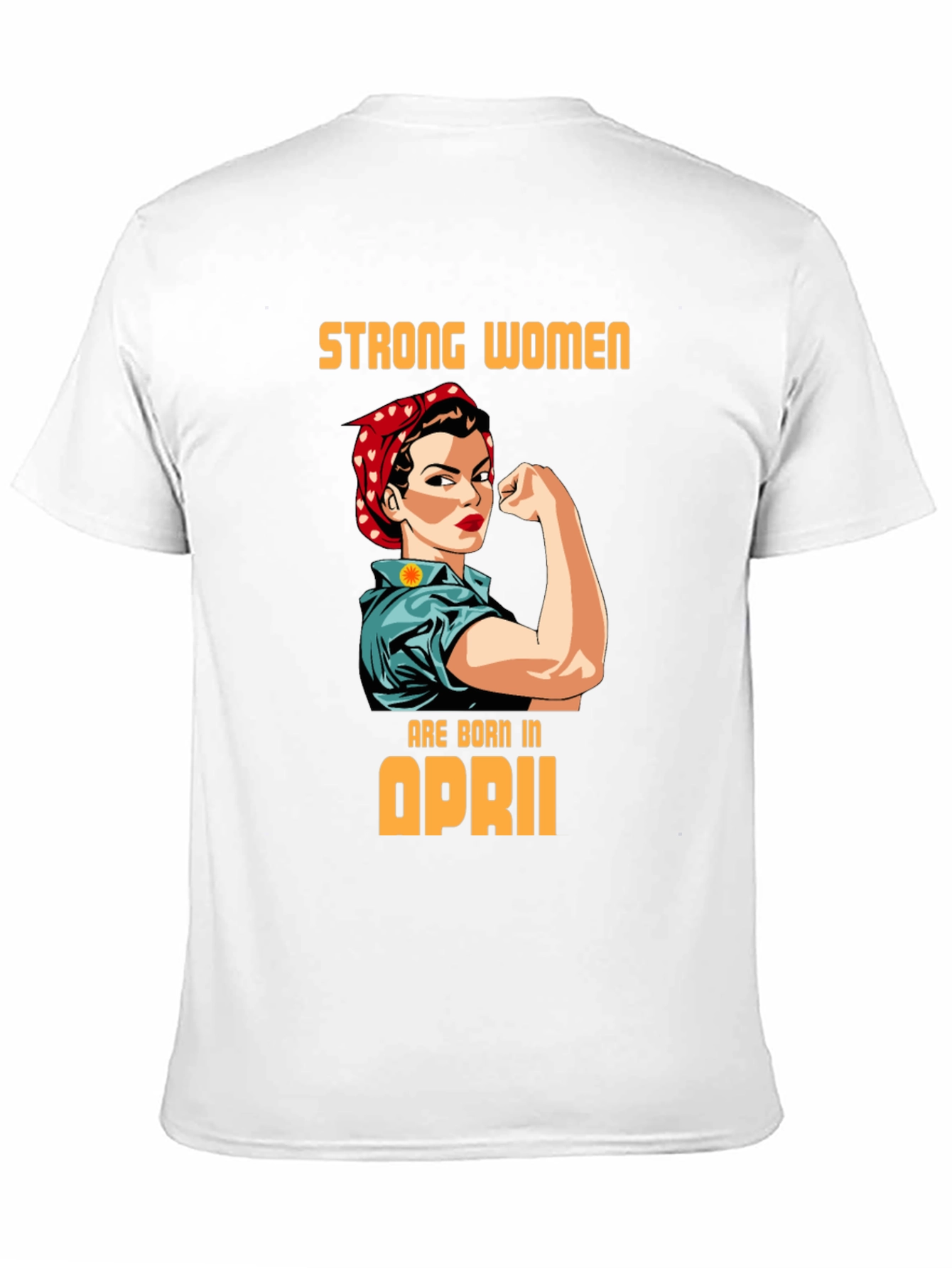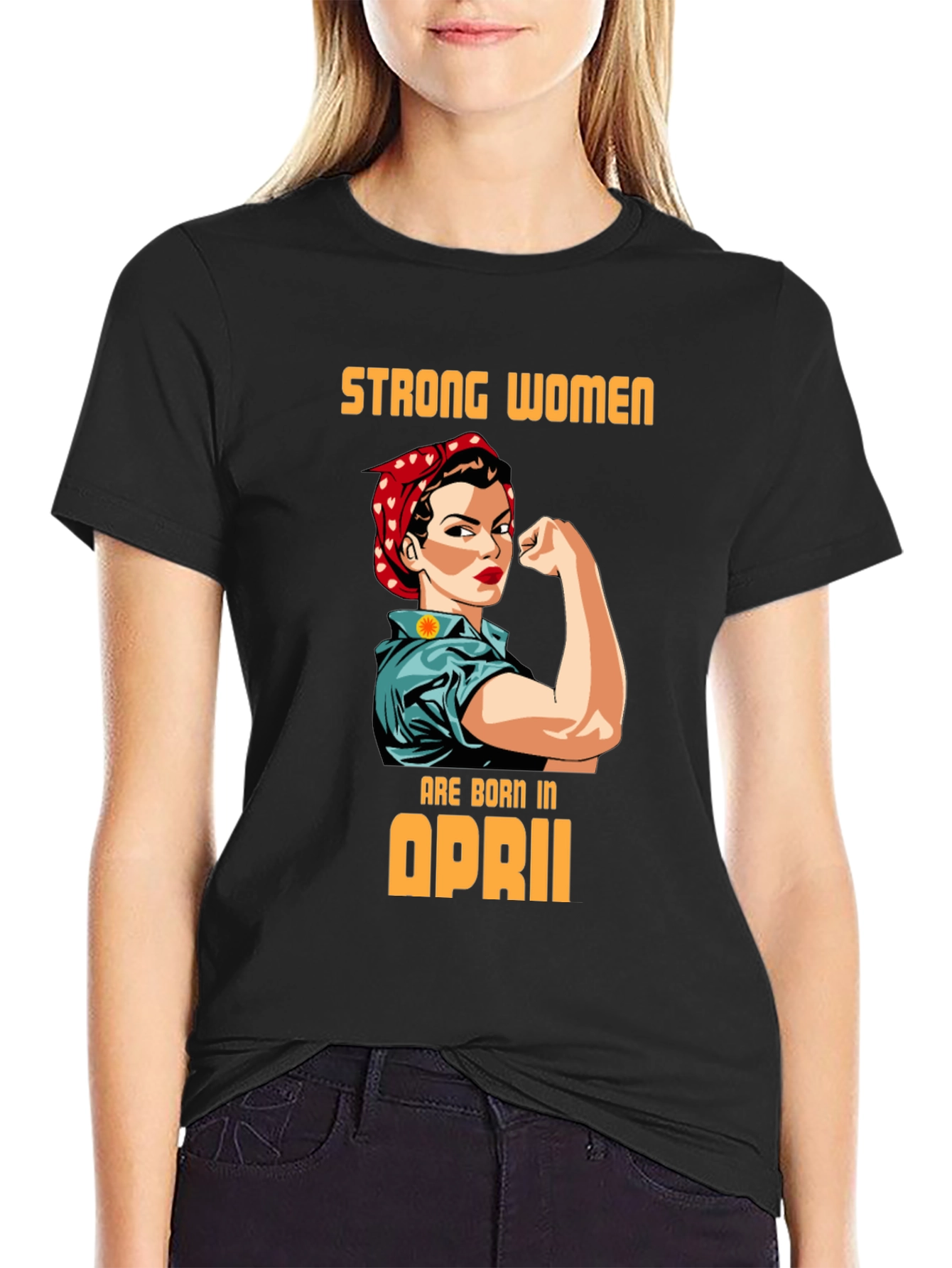 Luce esta camiseta negra que celebra la fortaleza femenina. El diseño presenta una ilustración estilo vintage de una mujer con un pañuelo rojo y el lema "Strong Women Are Born In April" (Mujeres Fuertes Nacen en Abril) en letras amarillas llamativas. Perfecta para mujeres nacidas en abril que se sienten identificadas con la imagen de poder y determinación. Ideal para usar en el día a día, eventos casuales o como un regalo especial para esa mujer fuerte en tu vida. ¡Muestra tu orgullo de ser una mujer nacida en abril con esta prenda única!