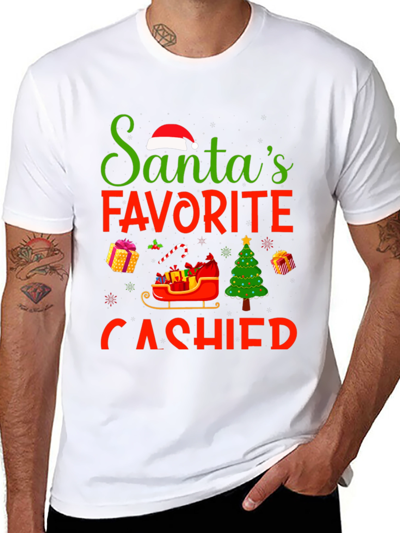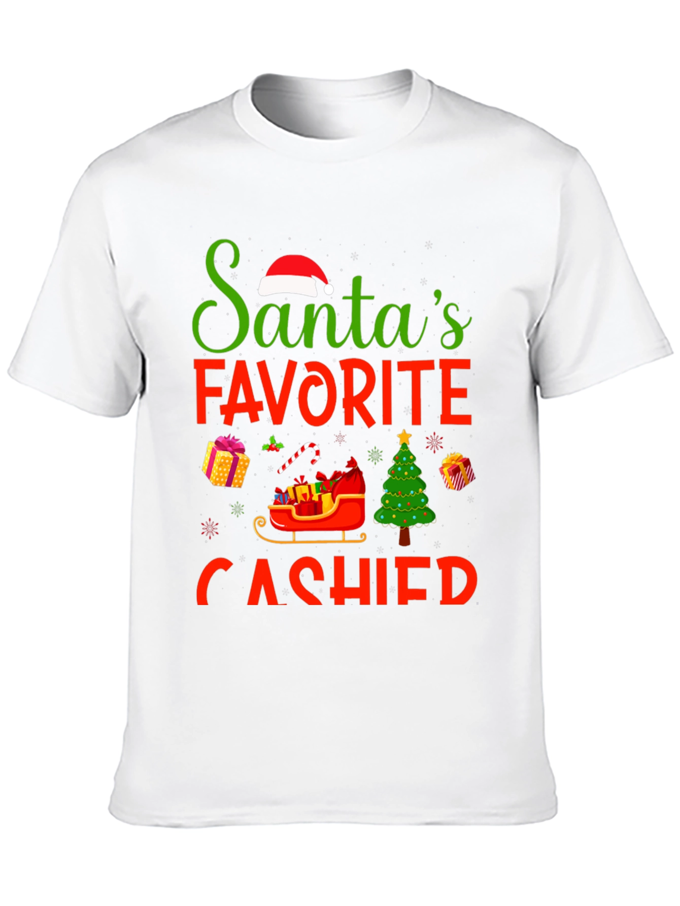 Celebra la temporada navideña con esta divertida camiseta negra. Presenta un diseño festivo con la frase 'Santa's Favorite' en letras verdes y rojas, con un gorro de Papá Noel encima. Debajo, un trineo lleno de regalos, un árbol de Navidad y otros adornos navideños añaden encanto. La palabra 'Cashier' (cajero) está impresa en rojo en la parte inferior. Perfecta para usar en el trabajo o en reuniones familiares, esta camiseta navideña te hará destacar con alegría navideña. ¡Muestra tu espíritu navideño con estilo!