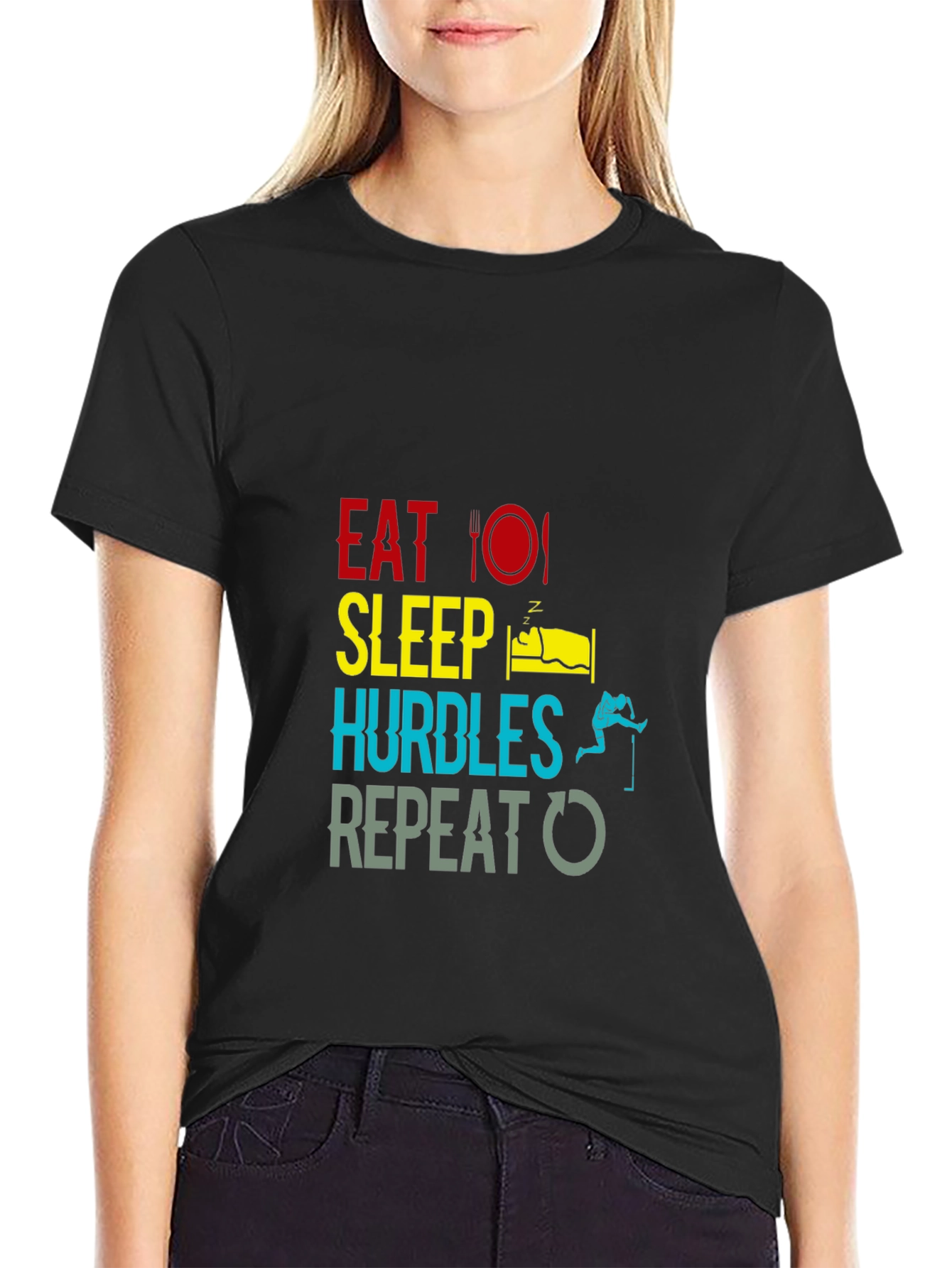 Esta camiseta negra de manga corta presenta un diseño llamativo y motivador. Con la frase "Eat, Sleep, Hurdles, Repeat" (Come, Duerme, Vallas, Repite) impresa en colores vibrantes, esta prenda es ideal para atletas y entusiastas del atletismo. El diseño incluye iconos representativos de cada palabra: un plato con cubiertos, una cama, un corredor saltando vallas y un símbolo de repetición. Fabricada en un material suave y cómodo, esta camiseta es perfecta para usar durante el entrenamiento, en el gimnasio o para el día a día. Muestra tu pasión por las vallas con esta camiseta única y original.