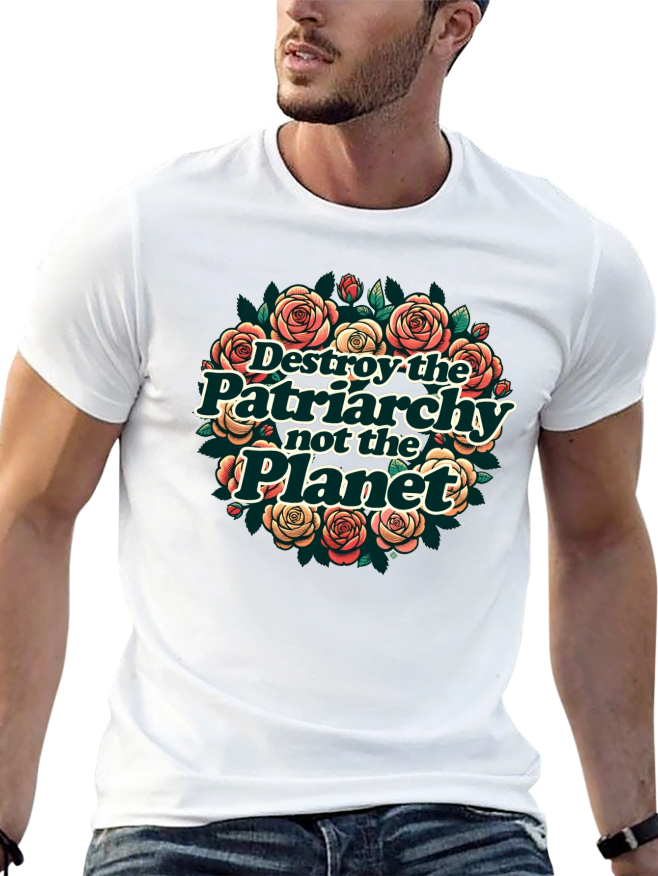 Esta camiseta negra de manga corta presenta un llamativo diseño circular con rosas y hojas. En el centro, una declaración poderosa: "Destruye el Patriarcado, No el Planeta". El diseño combina elementos florales con un mensaje de conciencia social, creando una prenda única y con estilo. Perfecta para expresar tus valores con un toque de moda. Ideal para usar en marchas, eventos sociales o simplemente para el día a día. Muestra tu compromiso con el feminismo y la sostenibilidad con esta camiseta original y atractiva.
