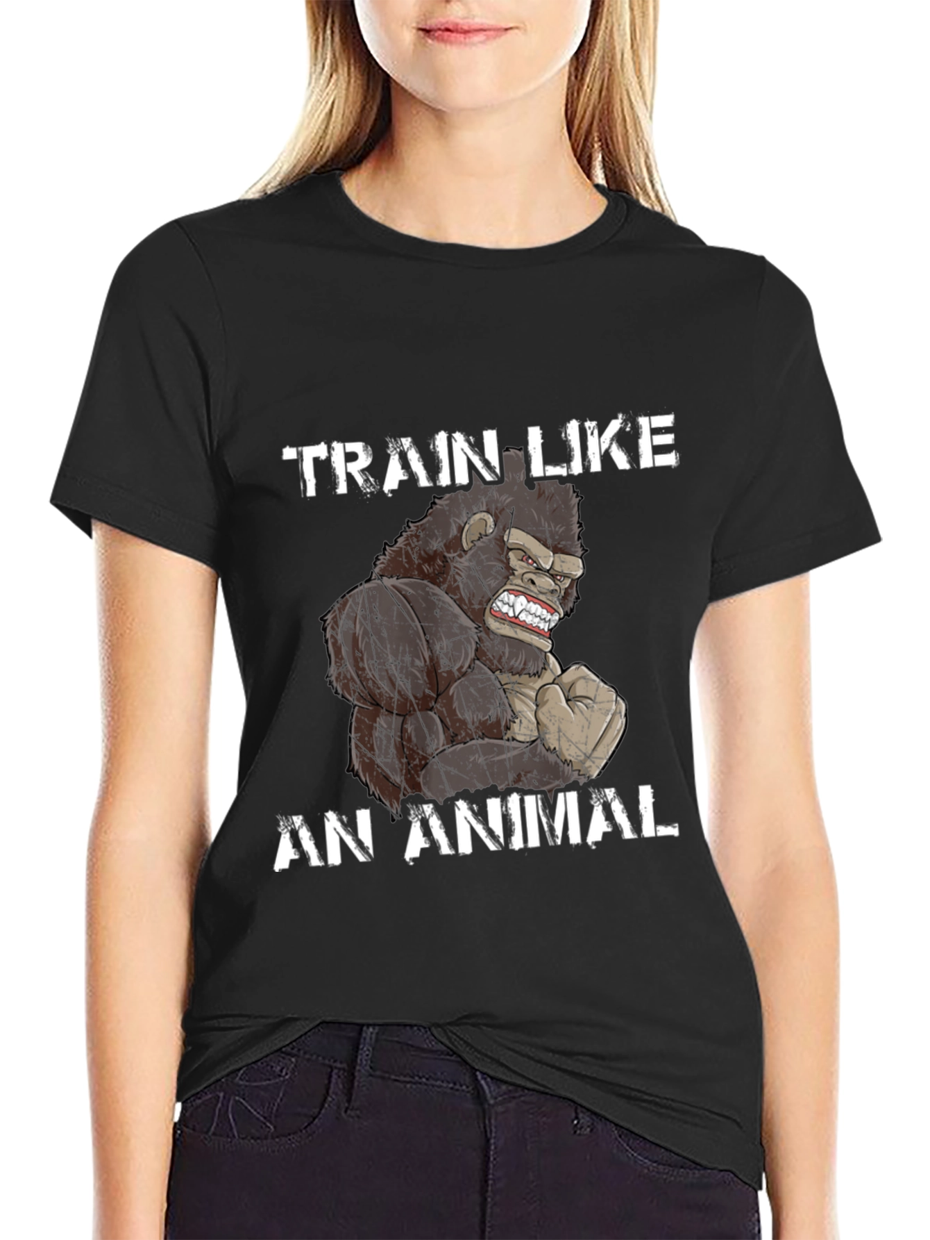 Esta camiseta negra presenta un diseño audaz para los amantes del gimnasio y el fitness. El diseño central muestra un gorila musculoso y agresivo, acompañado del texto "TRAIN LIKE AN ANIMAL", perfecto para inspirar entrenamientos intensos. Fabricada con materiales suaves y cómodos, es ideal para llevar durante tus sesiones de ejercicio o para un look casual con un toque de rebeldía. Muestra tu determinación y pasión por el fitness con esta prenda única y llamativa.