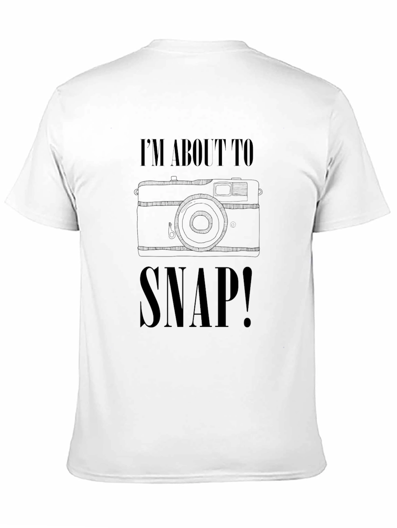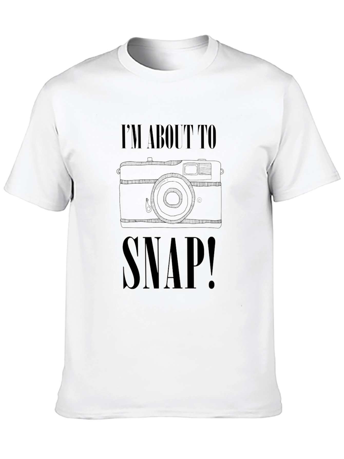 Esta elegante camiseta negra presenta un diseño gráfico que atraerá a los entusiastas de la fotografía. El diseño muestra una cámara retro estilizada acompañada del texto "I'M ABOUT TO SNAP!". Confeccionada en tela suave y cómoda, esta camiseta es perfecta para el uso diario. Ya sea que estés explorando la ciudad, en una sesión fotográfica casual o simplemente relajándote en casa, esta camiseta te permitirá expresar tu pasión por la fotografía con estilo. Ideal para fotógrafos, amantes de las cámaras y cualquier persona con un sentido del humor. Un regalo perfecto para cumpleaños o cualquier ocasión especial.