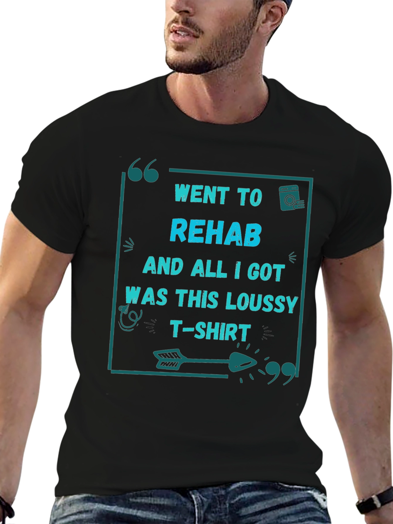 Esta camiseta negra presenta un diseño llamativo con el texto "FUI A REHABILITACIÓN Y TODO LO QUE CONSEGUÍ FUE ESTA CAMISETA DE MIERDA". El diseño está enmarcado con comillas y otros elementos gráficos en un tono azul verdoso. Confeccionada en un material que parece ser algodón, esta camiseta de manga corta ofrece comodidad y estilo. Perfecta para aquellos con un sentido del humor sarcástico y una perspectiva irónica. Úsala para expresar tu individualidad y generar conversación. Ideal para salidas casuales, reuniones con amigos o simplemente para relajarte en casa con un toque de irreverencia.