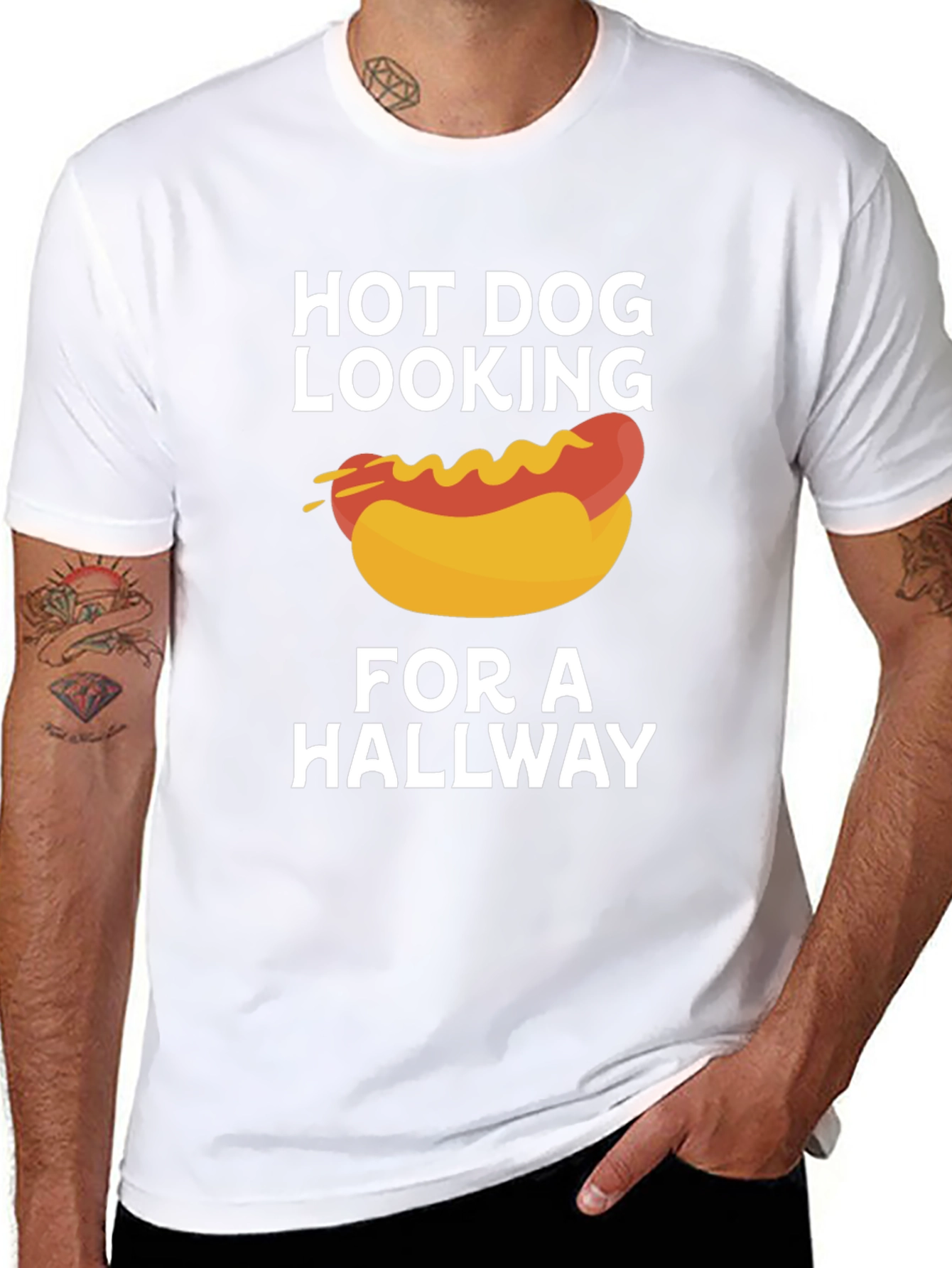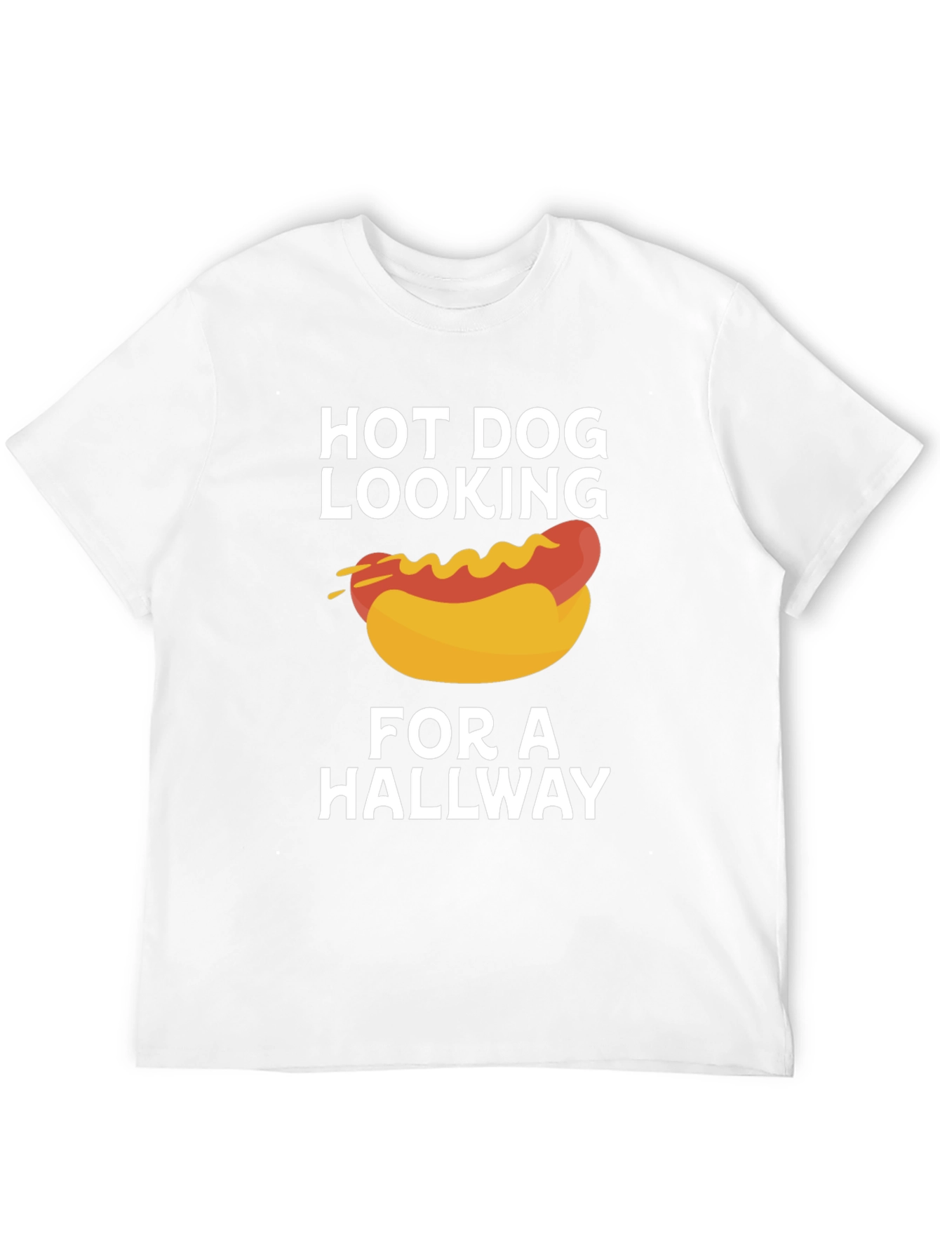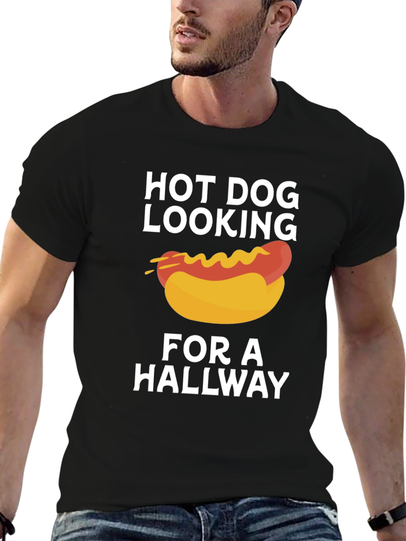 Esta camiseta negra presenta un divertido diseño con un hot dog estilizado cubierto de mostaza. Debajo y encima del dibujo, se lee la frase "HOT DOG LOOKING FOR A HALLWAY" en letras blancas. El tejido de la camiseta parece ser suave y cómodo, ideal para uso casual. Perfecta para amantes de la comida rápida o para aquellos con un sentido del humor peculiar. Llévala para destacar en cualquier reunión informal, fiesta o simplemente para expresar tu personalidad única. ¡Consigue esta camiseta original y divierte a todos con su diseño!