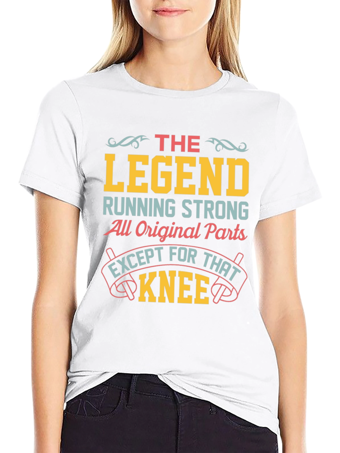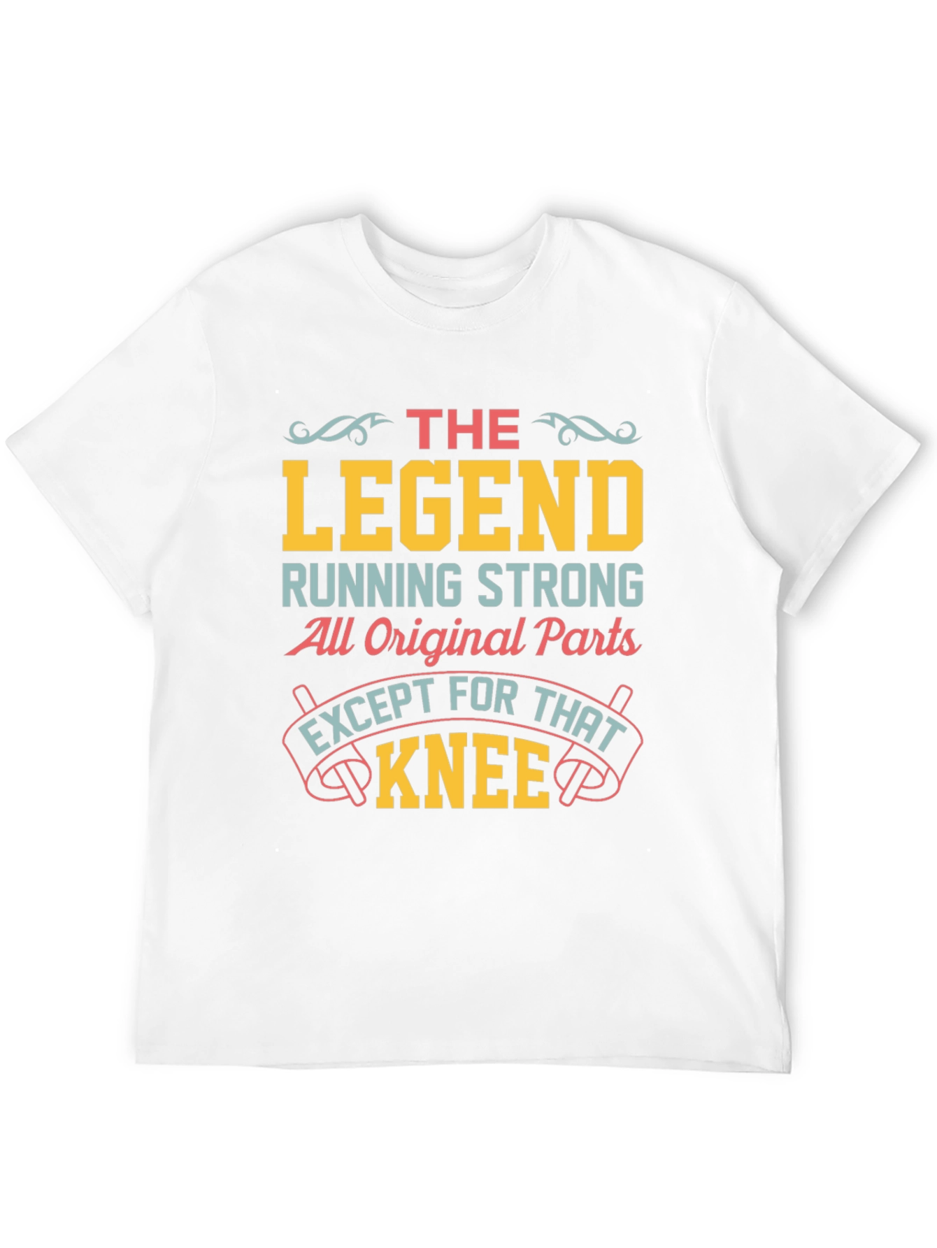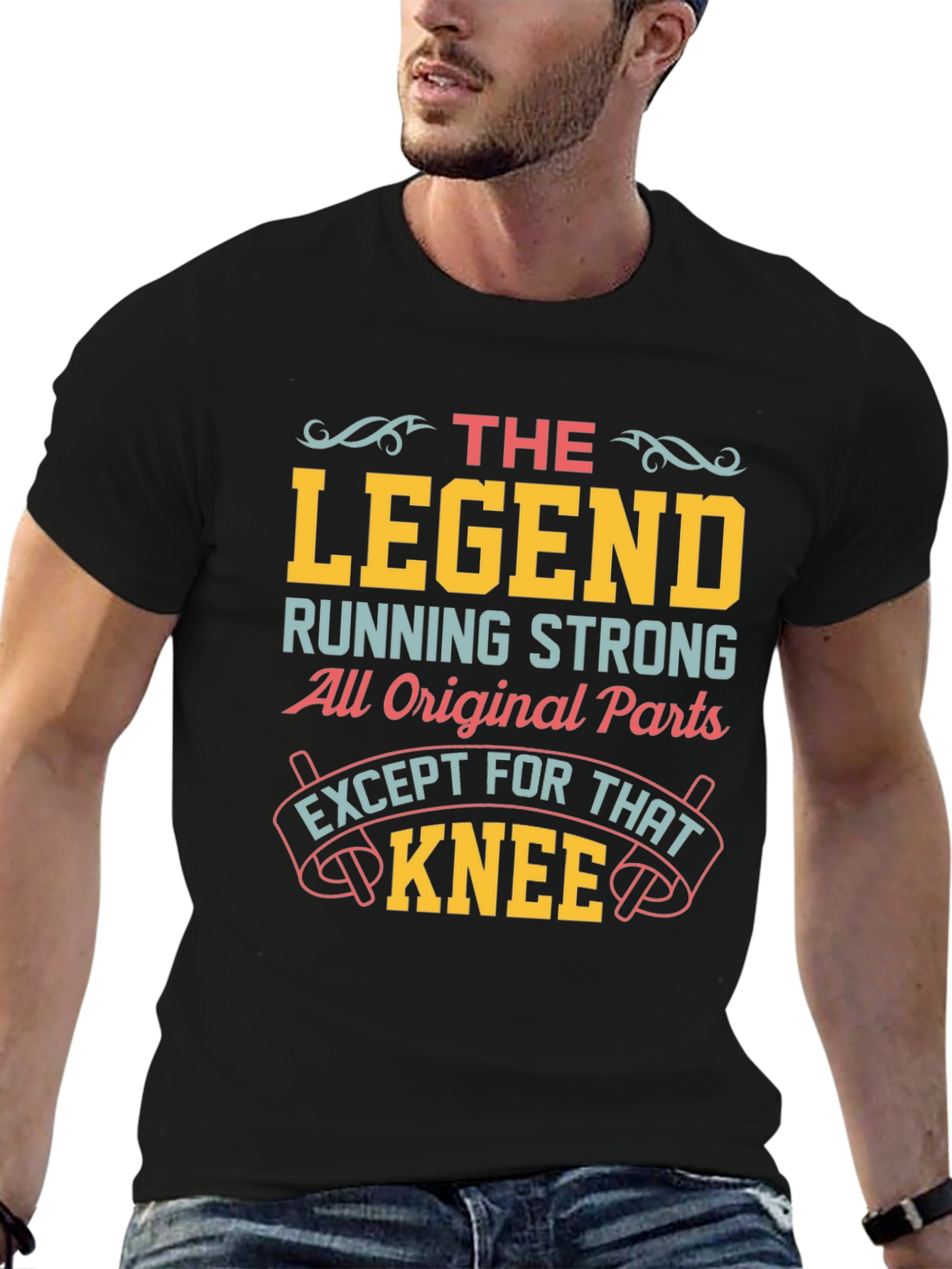 Presentamos esta llamativa camiseta negra de manga corta, perfecta para aquellos con un sentido del humor único. El diseño frontal presenta una divertida frase en capas: "THE LEGEND RUNNING STRONG All Original Parts EXCEPT FOR THAT KNEE". Las letras están destacadas en colores contrastantes como amarillo, celeste y rosa, añadiendo un toque vibrante. Ideal para usarla en el gimnasio, durante actividades al aire libre o simplemente para relajarse en casa, esta camiseta seguramente atraerá miradas y provocará sonrisas. Muestra tu espíritu resiliente con estilo y confort. ¡Una prenda imprescindible para los amantes de las bromas y las leyendas vivientes!