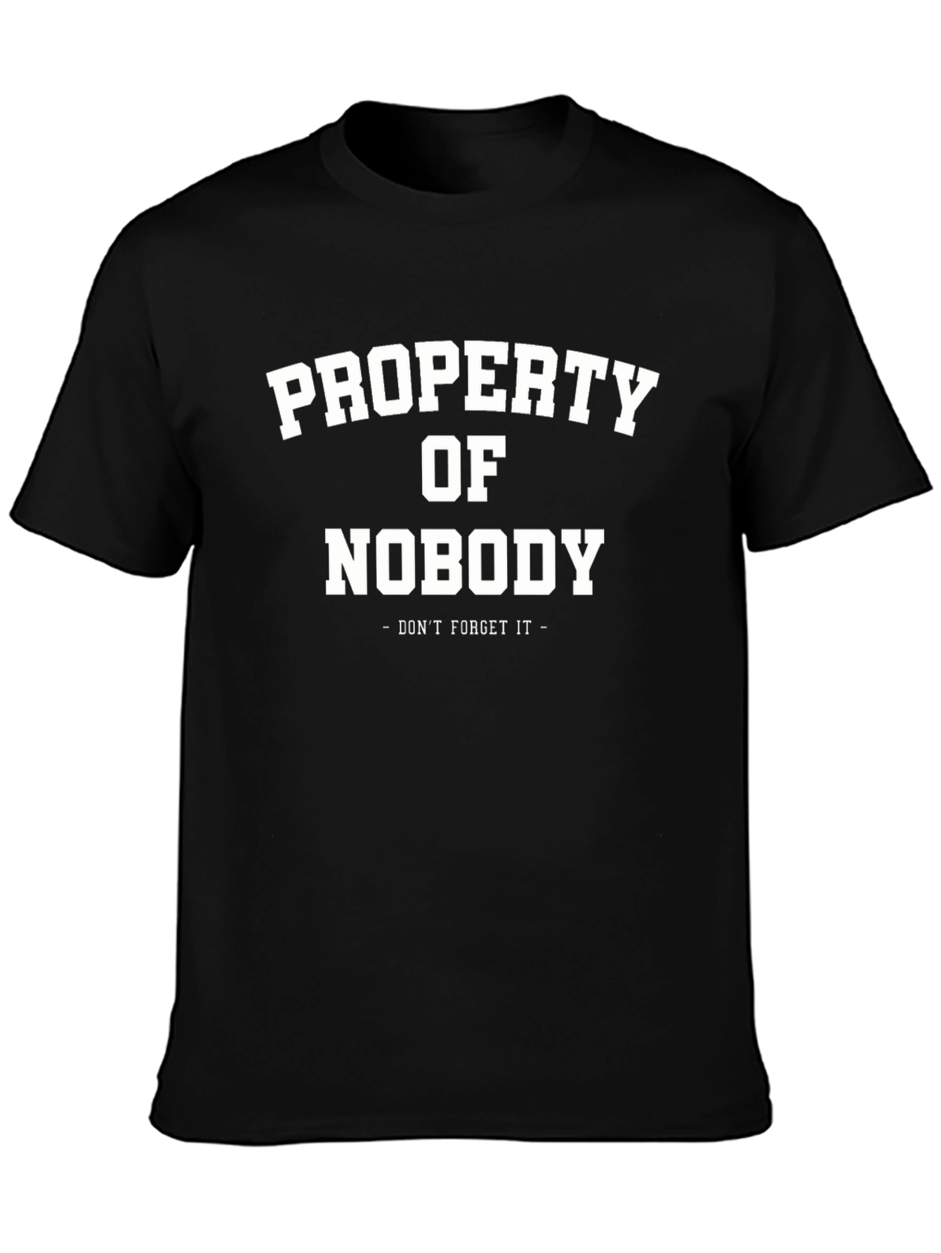 Luce esta atrevida camiseta negra que declara tu independencia con estilo. Fabricada en un tejido suave y cómodo, esta camiseta presenta un diseño llamativo con las palabras "PROPERTY OF NOBODY" impresas en letras blancas llamativas, complementado con la frase "- DON'T FORGET IT -". Perfecta para quienes aman expresar su individualidad y un espíritu libre, esta camiseta es ideal para usar en salidas casuales, reuniones con amigos o simplemente relajarse en casa. Combínala con jeans, pantalones cortos o faldas para crear un look único y audaz que refleje tu personalidad. ¡Demuestra al mundo que eres dueño de tu propio destino con esta camiseta que marca la diferencia!