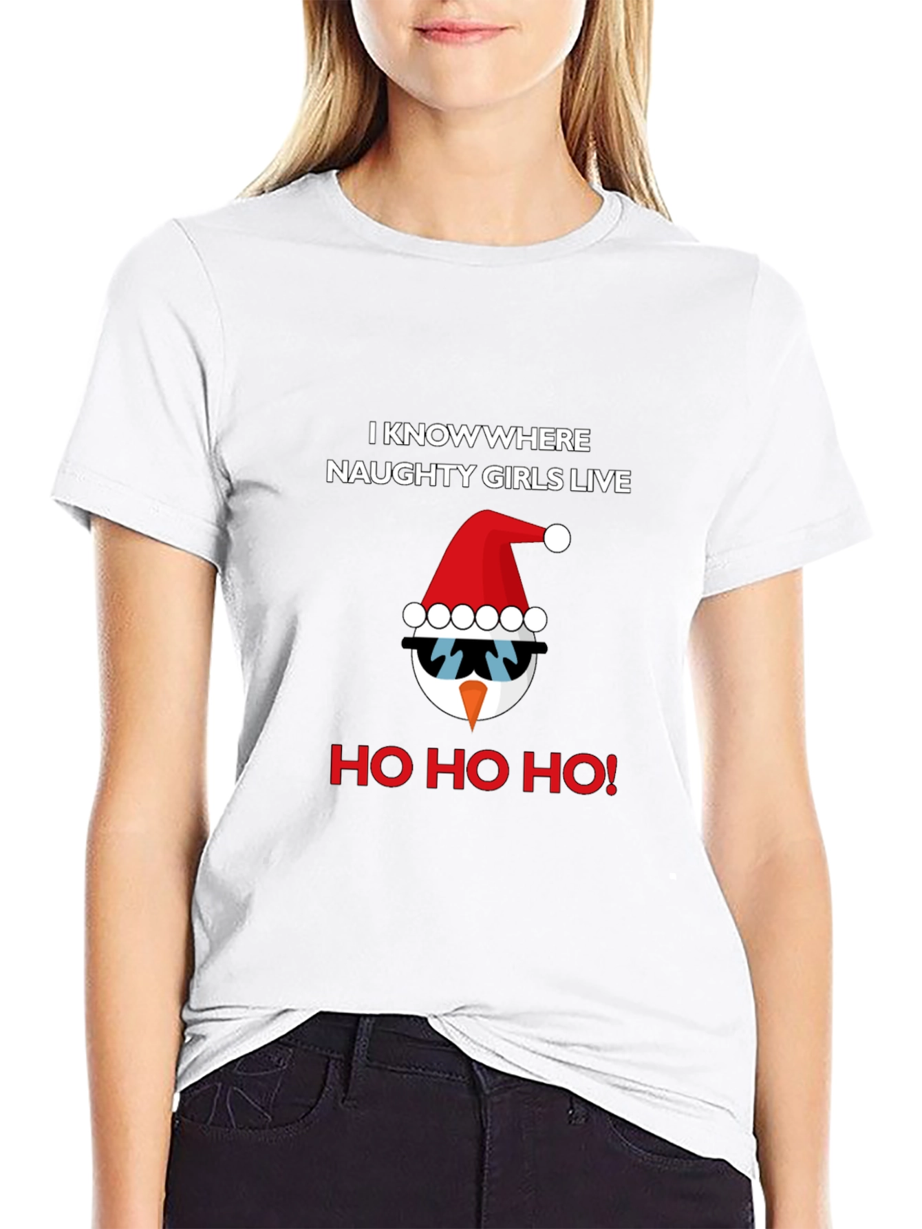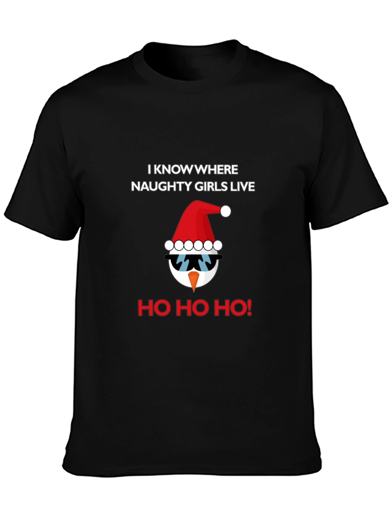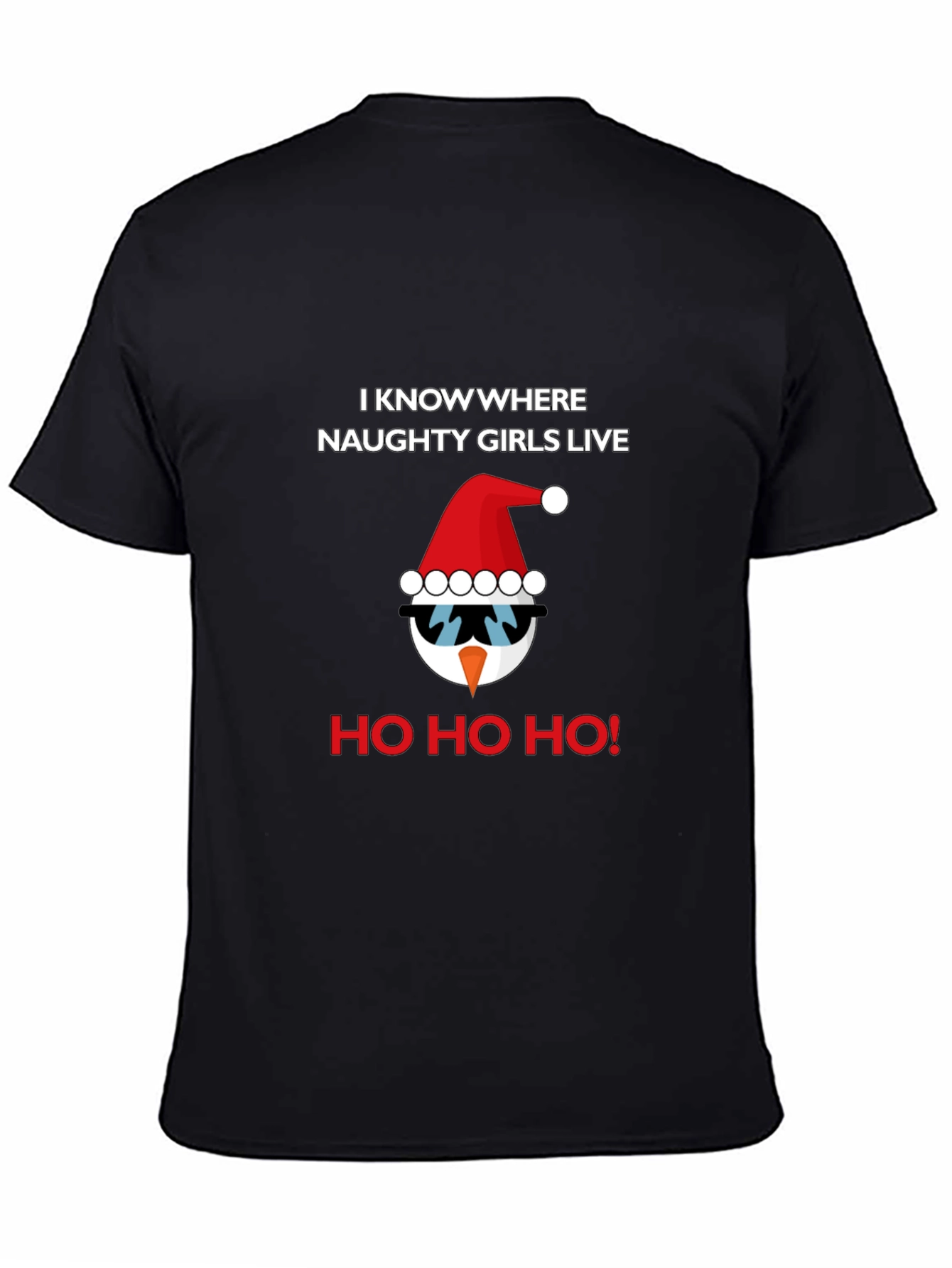 Luce un estilo divertido y provocador con esta camiseta negra de manga corta. Con un diseño llamativo, la camiseta presenta la frase "I KNOW WHERE NAUGHTY GIRLS LIVE" (Sé dónde viven las chicas traviesas) en letras blancas, acompañada de un pingüino con gorro navideño. Este diseño audaz y original es perfecto para llamar la atención y expresar tu sentido del humor. Ideal para fiestas navideñas, salidas casuales o como un regalo ingenioso para amigos y familiares. Fabricada con materiales suaves y cómodos, esta camiseta te mantendrá fresco y a la moda durante todo el día. ¡Atrévete a destacar con esta prenda única!