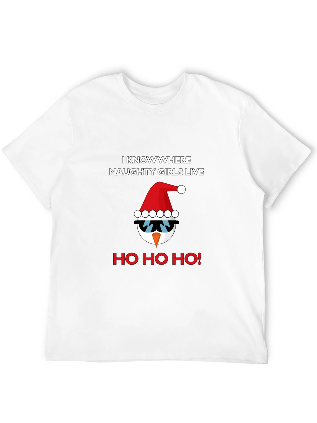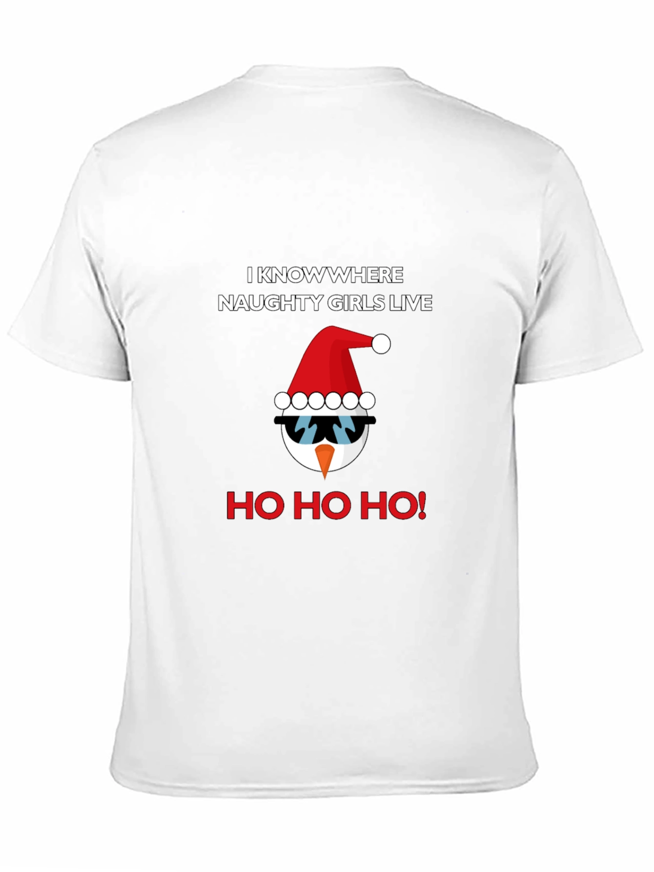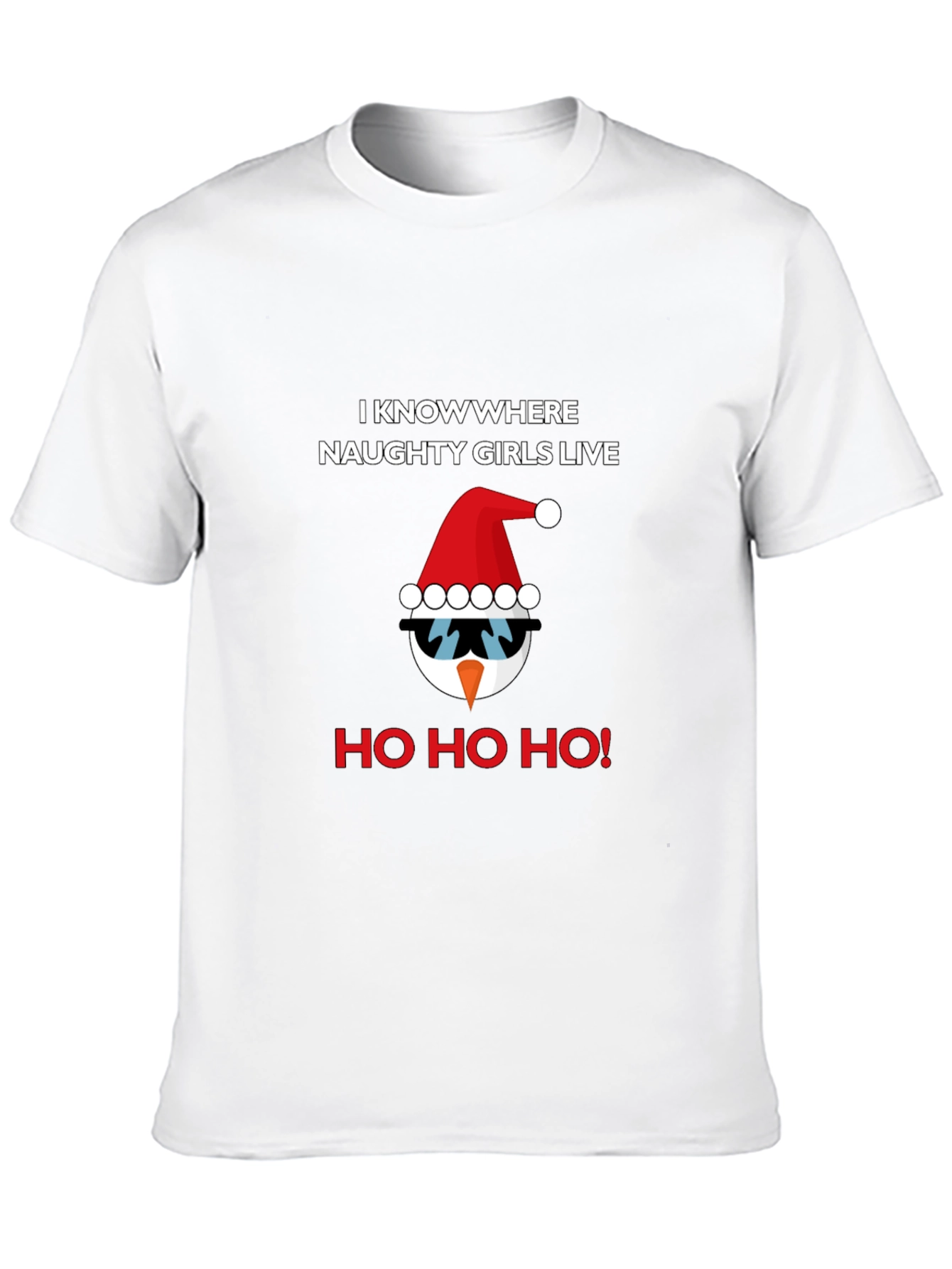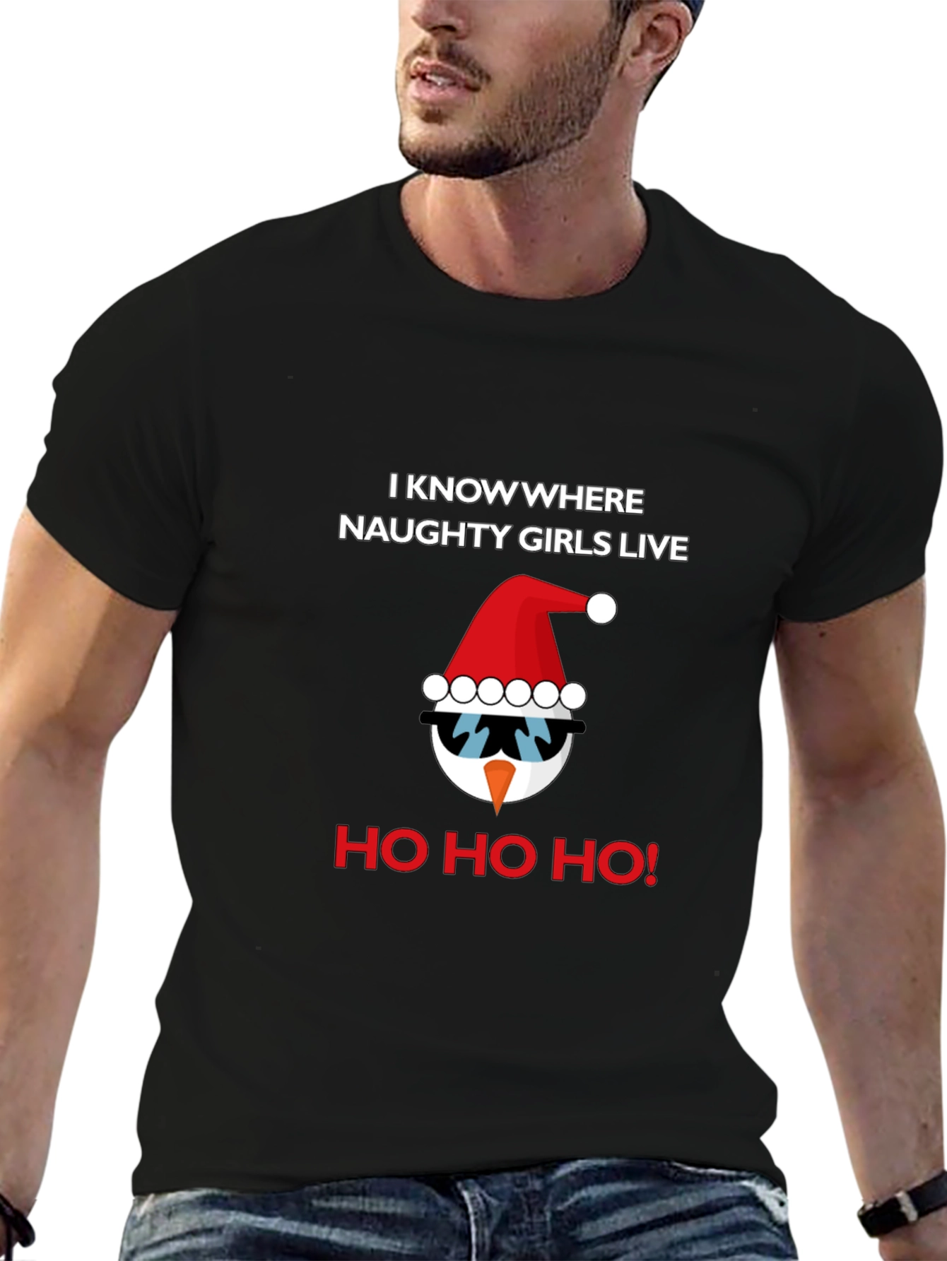 Luce un estilo divertido y provocador con esta camiseta negra de manga corta. Con un diseño llamativo, la camiseta presenta la frase "I KNOW WHERE NAUGHTY GIRLS LIVE" (Sé dónde viven las chicas traviesas) en letras blancas, acompañada de un pingüino con gorro navideño. Este diseño audaz y original es perfecto para llamar la atención y expresar tu sentido del humor. Ideal para fiestas navideñas, salidas casuales o como un regalo ingenioso para amigos y familiares. Fabricada con materiales suaves y cómodos, esta camiseta te mantendrá fresco y a la moda durante todo el día. ¡Atrévete a destacar con esta prenda única!