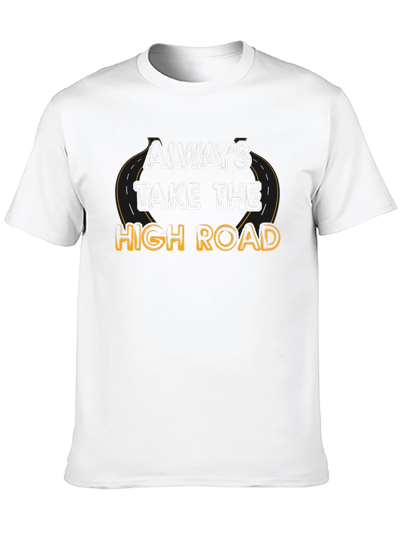 Destaca con esta camiseta negra de manga corta que presenta un diseño llamativo. En el pecho, se lee la frase "ALWAYS TAKE THE HIGH ROAD", con las palabras "ALWAYS" en blanco, "TAKE THE" en blanco resaltado y "HIGH ROAD" en un distintivo color naranja/amarillo. El diseño incorpora un sutil motivo de carretera que evoca aventura y superación. Ideal para un estilo casual y relajado, esta camiseta es perfecta para expresar tu filosofía de vida con un toque moderno y original. Combínala con jeans o pantalones deportivos para un look cómodo y con estilo.