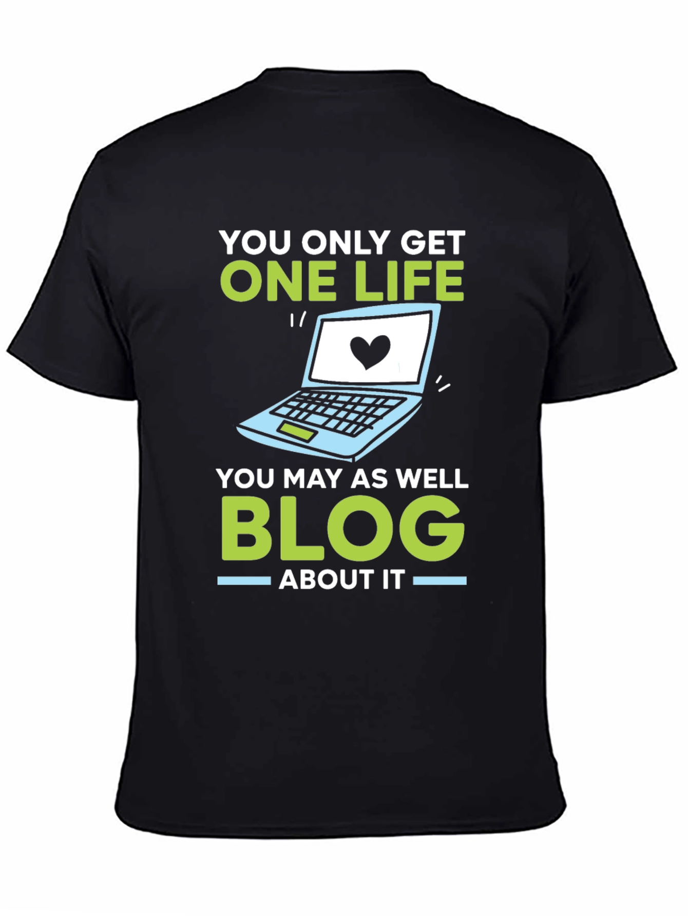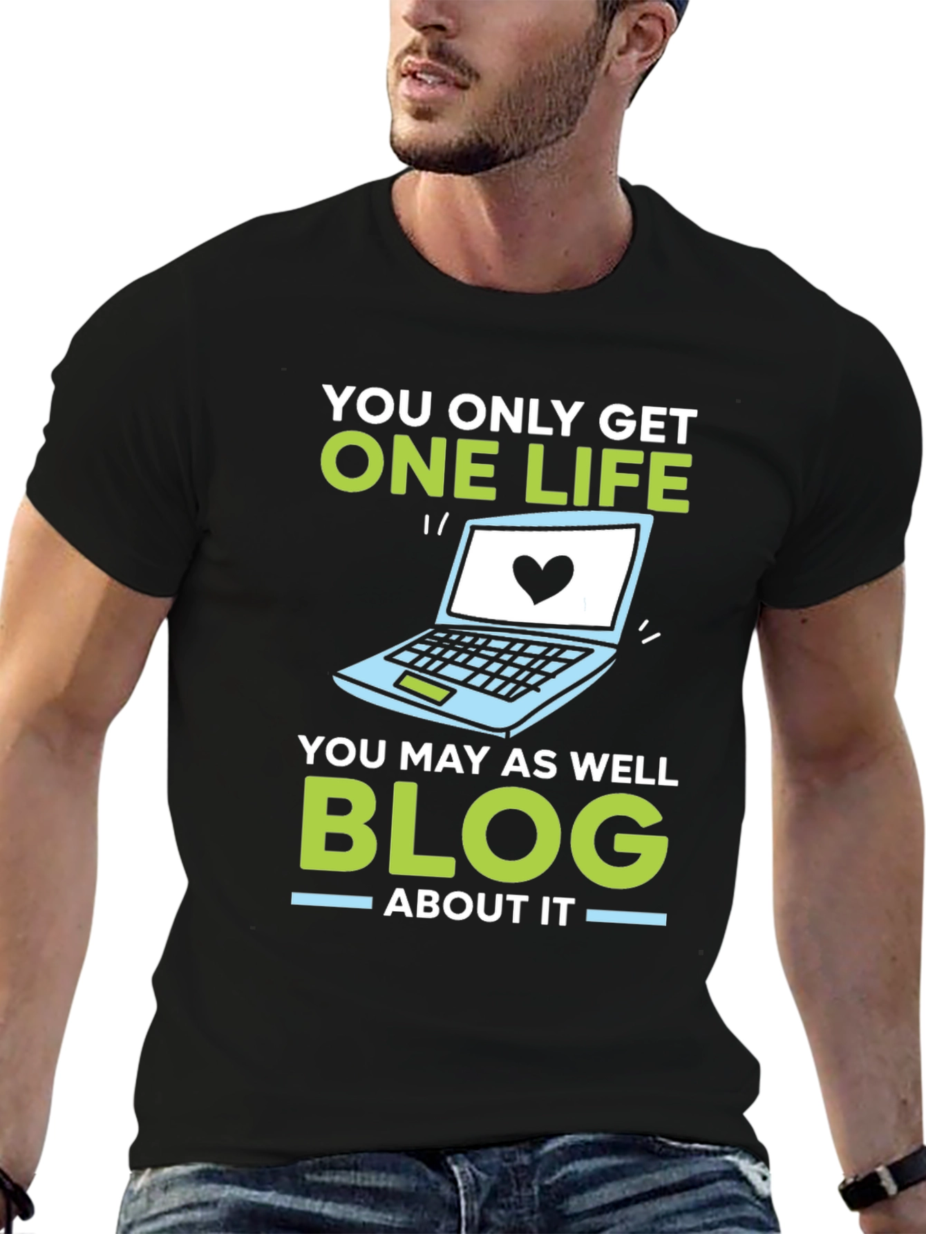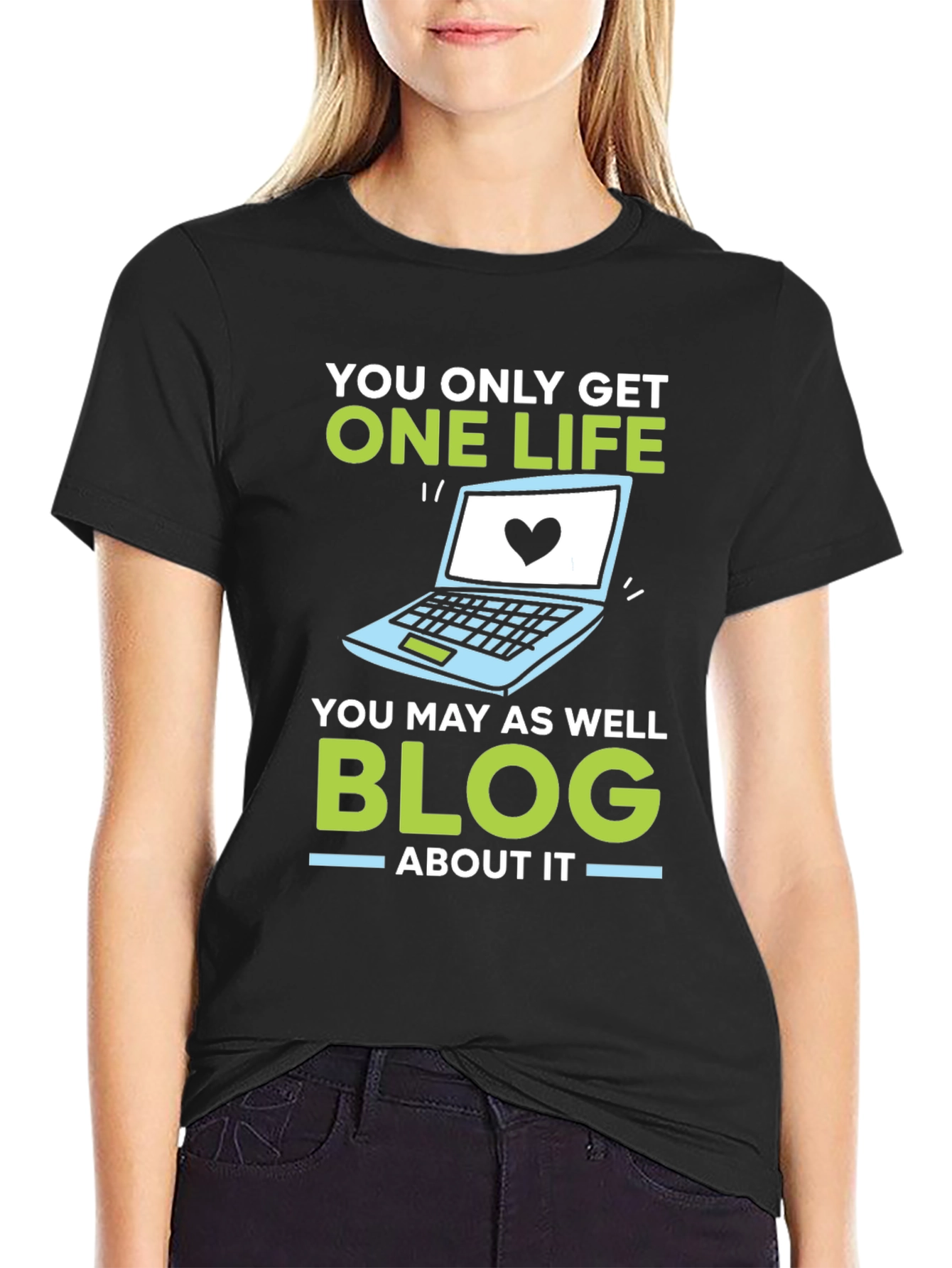 Luce esta camiseta negra de diseño único que captura el espíritu de la vida moderna. Con un estampado llamativo que presenta la frase "You Only Get ONE LIFE, You May As Well BLOG About It" (Solo tienes UNA VIDA, bien puedes bloguear sobre ella), junto con una ilustración de un portátil con un corazón en la pantalla, esta camiseta es perfecta para los amantes de la tecnología, los bloggers y aquellos que abrazan la vida al máximo. Su diseño creativo y mensaje inspirador la hacen ideal para uso diario, eventos casuales o como un regalo original para amigos y familiares. Muestra tu pasión por compartir tus experiencias con estilo y comodidad.