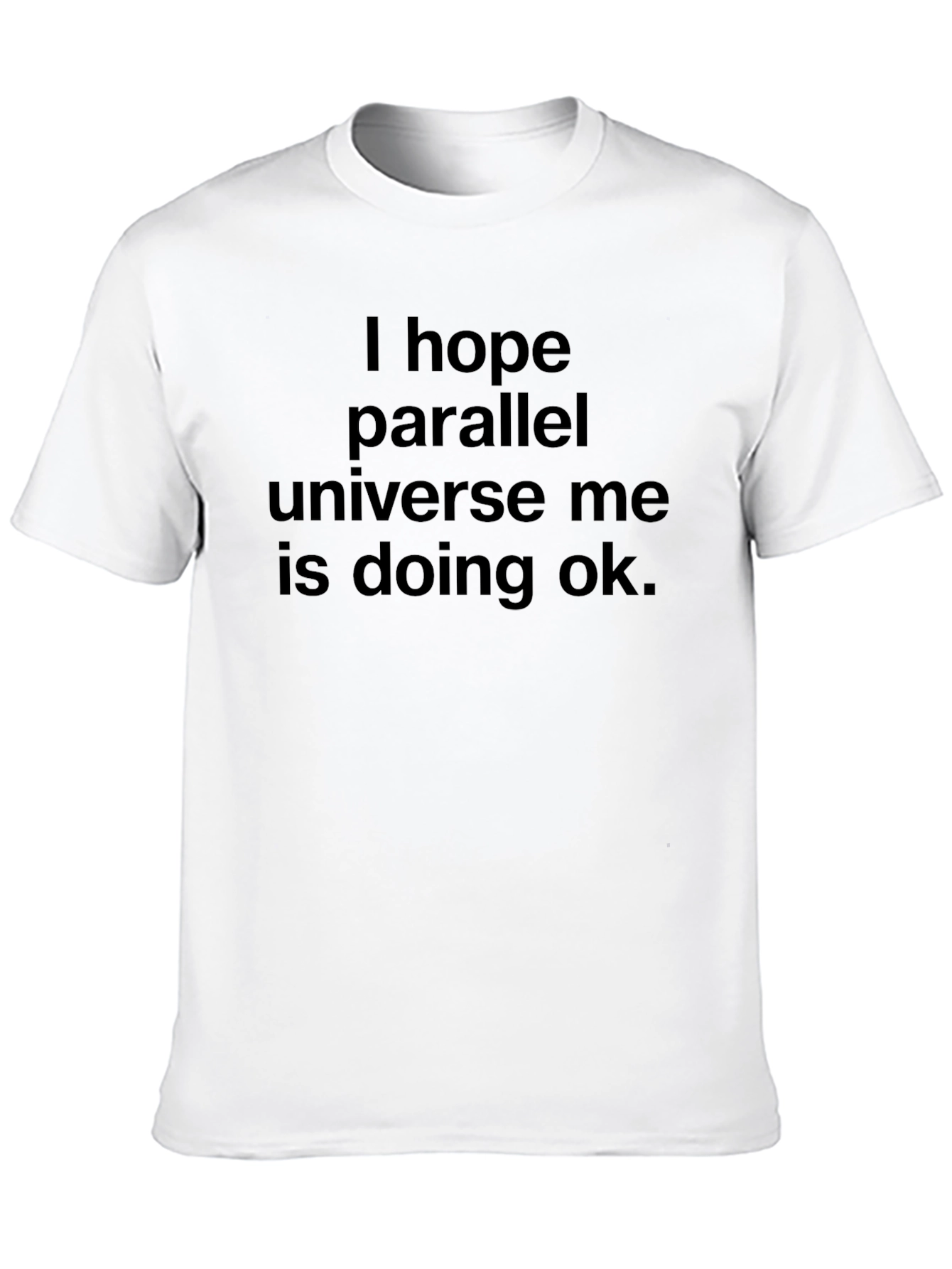 Esta camiseta negra presenta un diseño único y llamativo. Confeccionada con un material suave y cómodo, esta prenda es perfecta para el uso diario. En la parte frontal, se destaca la frase "I hope parallel universe me is doing ok." estampada en un tipo de letra clara y legible. Ideal para aquellos que buscan expresar su individualidad y sentido del humor. Combina fácilmente con vaqueros, pantalones cortos o faldas. Perfecta para salidas casuales, reuniones con amigos o simplemente relajarse en casa. Una adición imprescindible para cualquier guardarropa moderno y original.