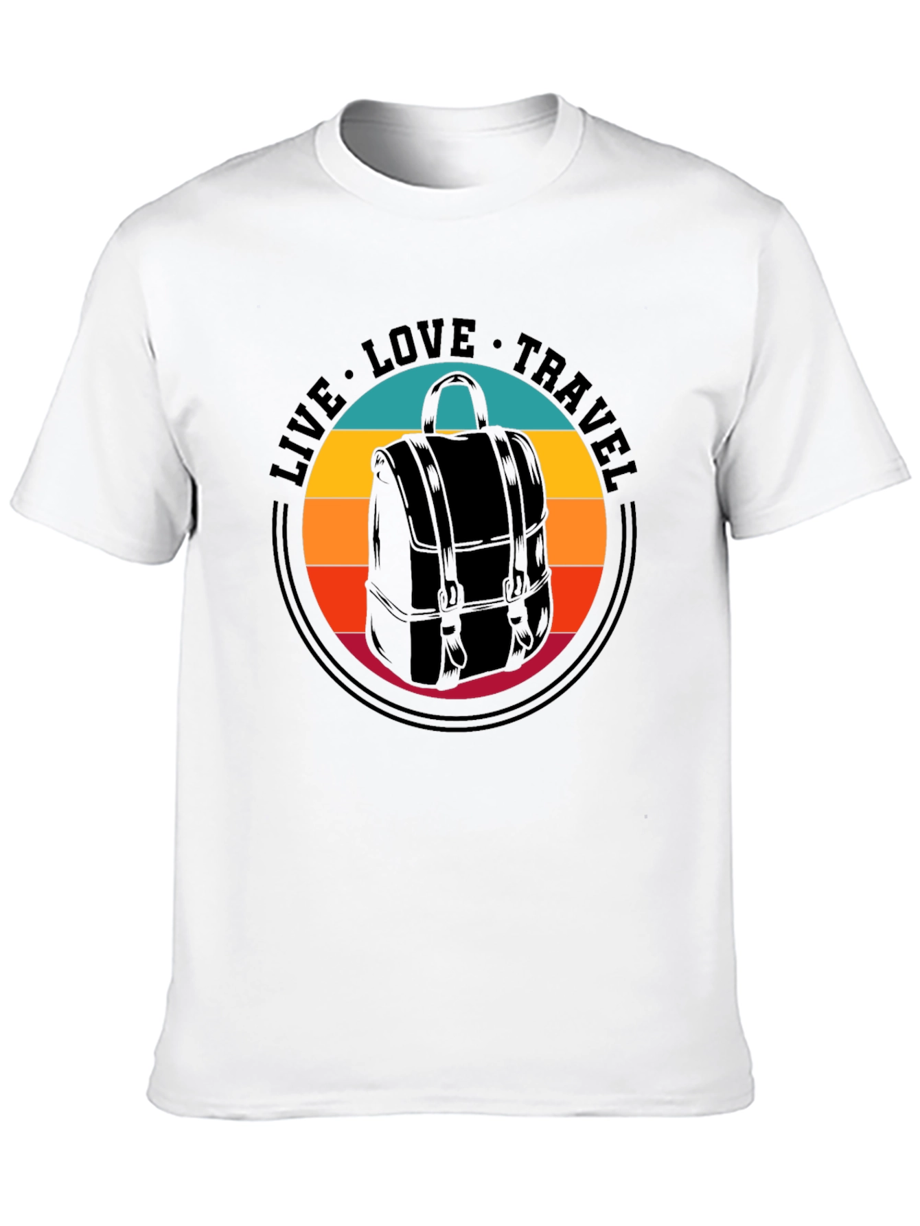 Luce esta moderna camiseta negra con un diseño único inspirado en la aventura. El estampado presenta una mochila retro enmarcada en un círculo con franjas de colores estilo atardecer, junto con el lema inspirador: "Vive, Ama, Viaja". Fabricada con un tejido suave y cómodo, esta camiseta de corte clásico es ideal para el uso diario, para expresar tu pasión por los viajes y tu espíritu libre. Combínala con tus jeans favoritos o pantalones casuales para un look relajado pero con estilo. Perfecta para viajeros, amantes de la naturaleza o para aquellos que buscan una prenda original y con significado. ¡Atrévete a llevar tu espíritu aventurero a donde vayas!