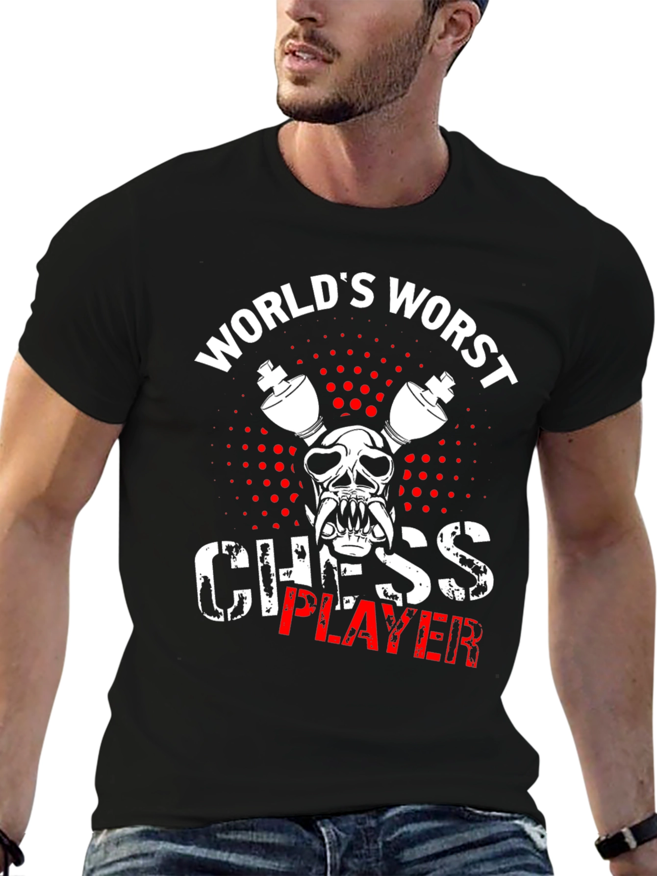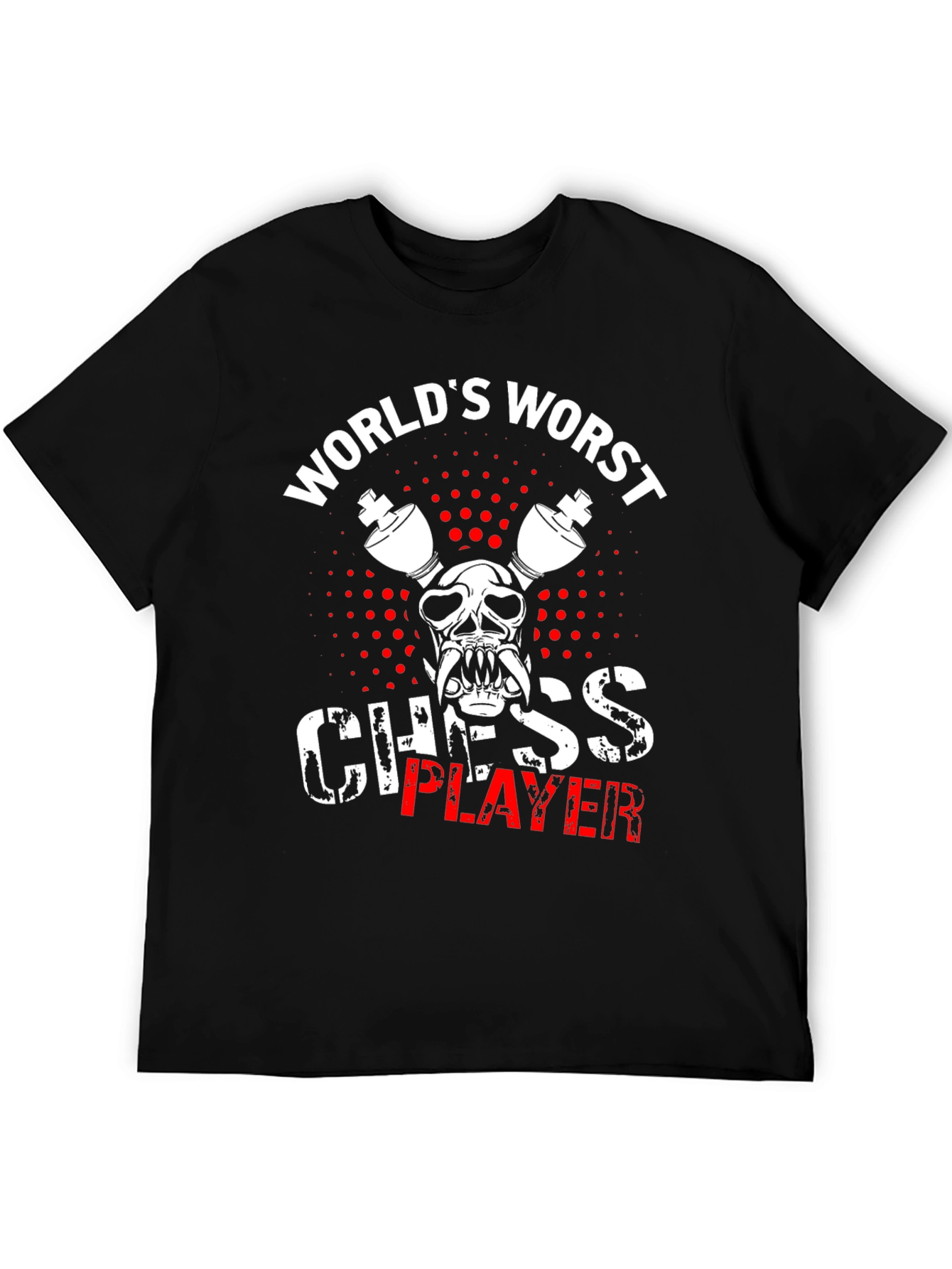 Demuestra tu humor con esta camiseta negra de manga corta. Presenta un diseño llamativo con el texto "World's Worst Chess Player" (El peor jugador de ajedrez) en letras blancas y rojas, adornado con una ilustración de calavera con piezas de ajedrez. Ideal para fanáticos del ajedrez con sentido del humor, esta camiseta es perfecta para usar en torneos informales, clubes de ajedrez o simplemente para destacar con estilo. El estampado gráfico resalta sobre el fondo negro, captando la atención y generando conversación. Confeccionada con materiales suaves y cómodos, esta camiseta ofrece un ajuste relajado para uso diario. ¡Luce tu lado divertido y destaca entre la multitud con esta original prenda!