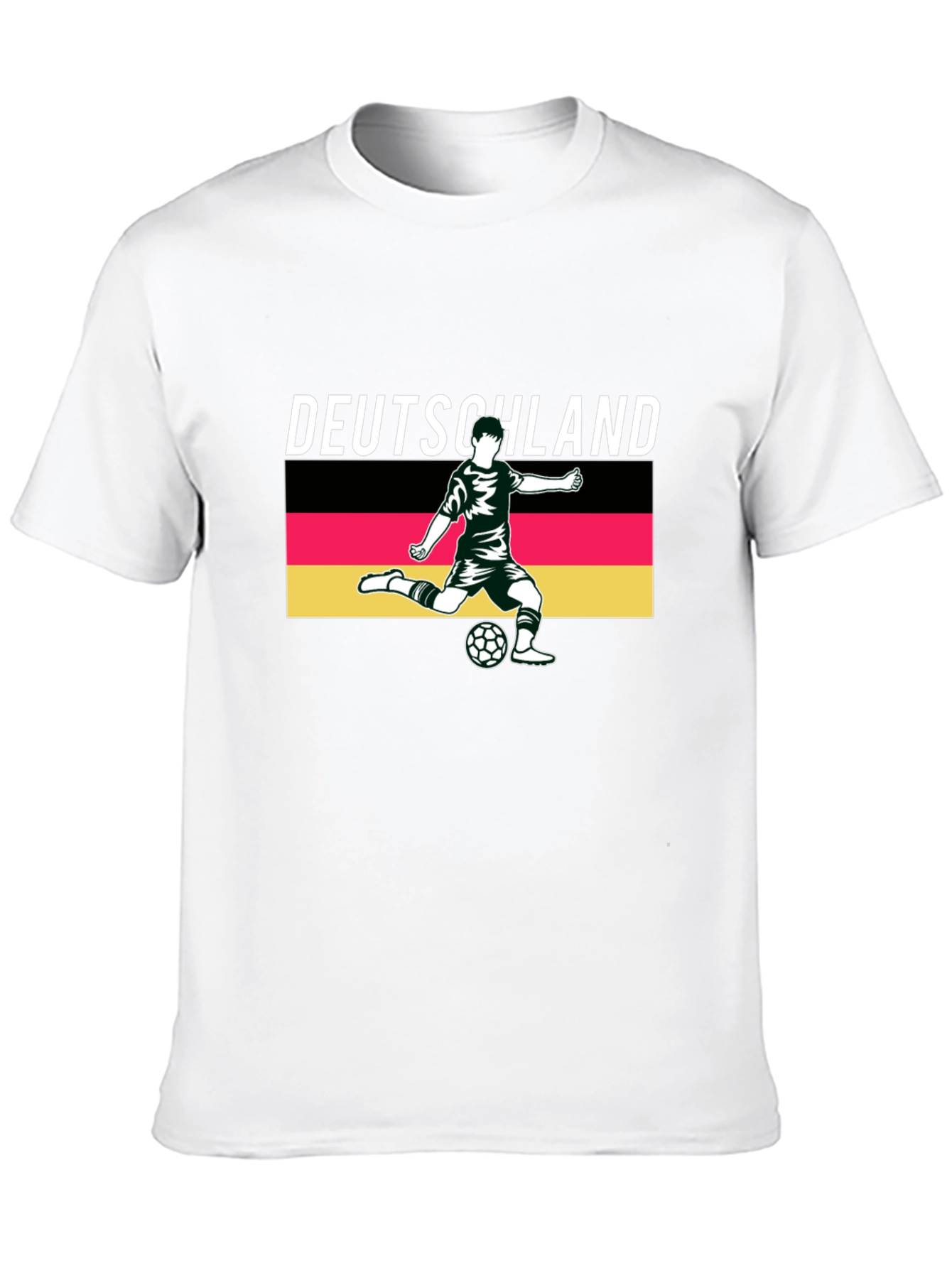 Muestra tu pasión por el fútbol alemán con esta camiseta negra de estilo deportivo. Presenta un diseño llamativo con la palabra "DEUTSCHLAND" sobre una imagen de un futbolista pateando un balón, todo ello sobre los colores de la bandera alemana. Ideal para usar durante partidos, entrenamientos o simplemente para mostrar tu apoyo a la selección alemana. Fabricada en un tejido suave y cómodo, esta camiseta es perfecta para cualquier aficionado al fútbol. ¡Luce con orgullo los colores de Alemania!