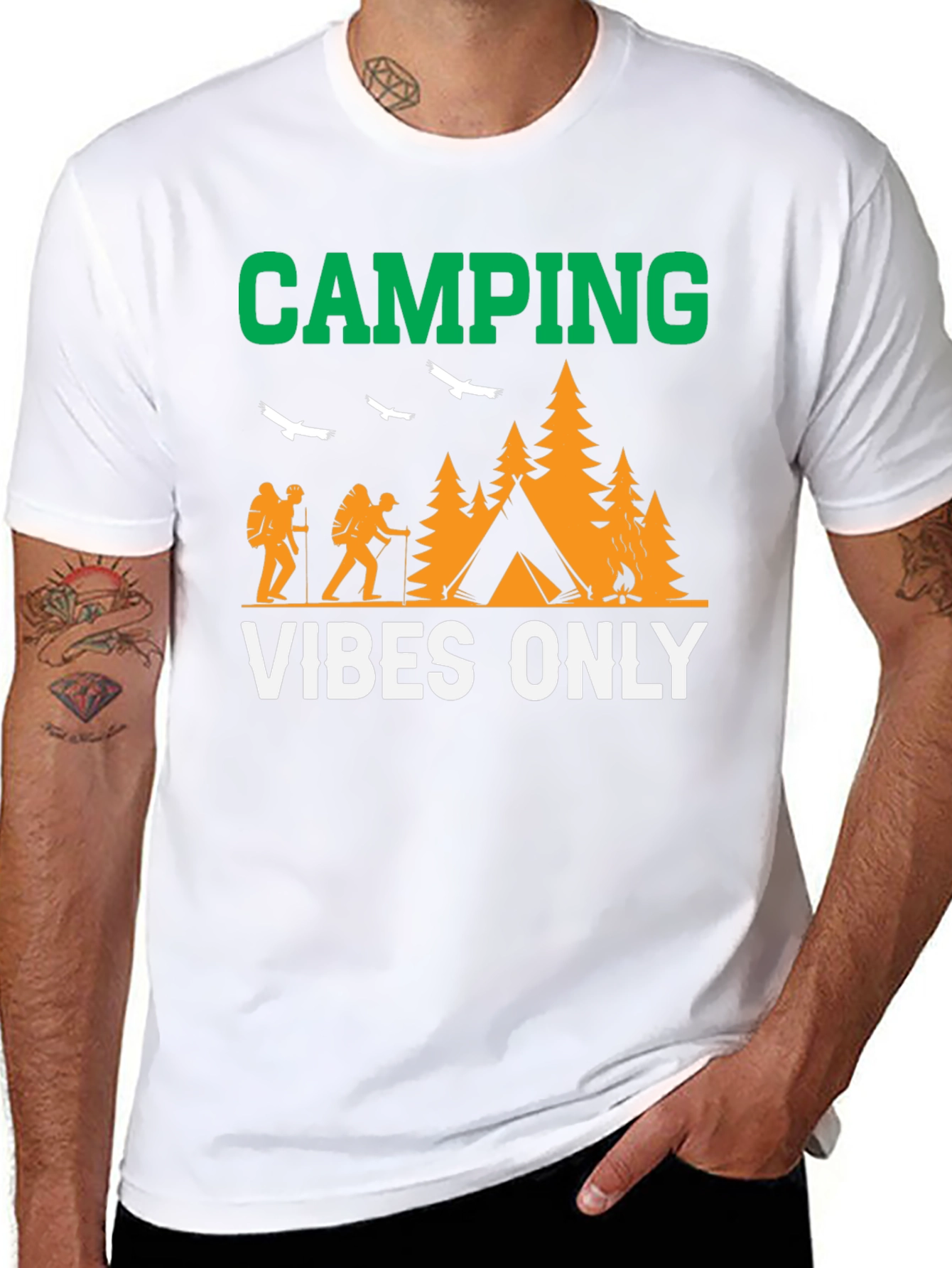 Esta camiseta negra de manga corta presenta un diseño temático de camping. Destaca la frase "CAMPING VIBES ONLY" en letras verdes y blancas, acompañada de una ilustración de excursionistas, aves volando, una tienda de campaña y árboles de pino en tonos naranja y amarillo. La camiseta parece ser de algodón o una mezcla suave al tacto. Es ideal para los amantes de la naturaleza, los campamentos y las actividades al aire libre. Perfecta para usar en excursiones, fogatas o simplemente para expresar tu pasión por la vida al aire libre con estilo y comodidad. ¡Muestra tu espíritu aventurero con esta prenda única!