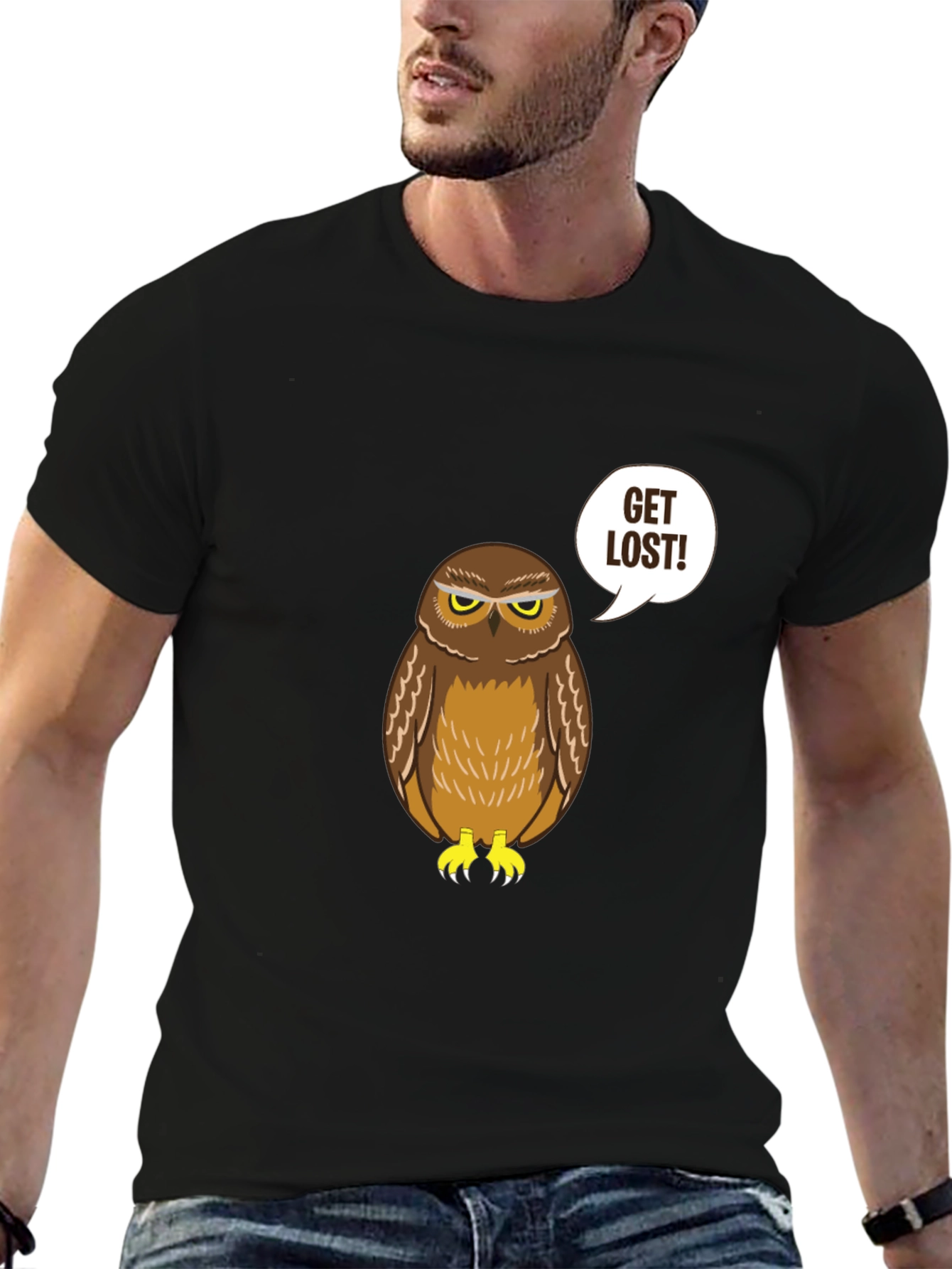 Esta camiseta negra presenta un diseño llamativo y divertido. En el centro, destaca un búho de dibujos animados con una expresión seria y ceño fruncido. Una burbuja de diálogo a su lado dice "¡Piérdete!", añadiendo un toque de humor irreverente. La camiseta parece ser de un material suave y cómodo, ideal para uso diario. Su diseño único la convierte en una excelente opción para aquellos que buscan expresar su personalidad y sentido del humor. Perfecta para usar en salidas casuales, reuniones con amigos o simplemente relajarse en casa.