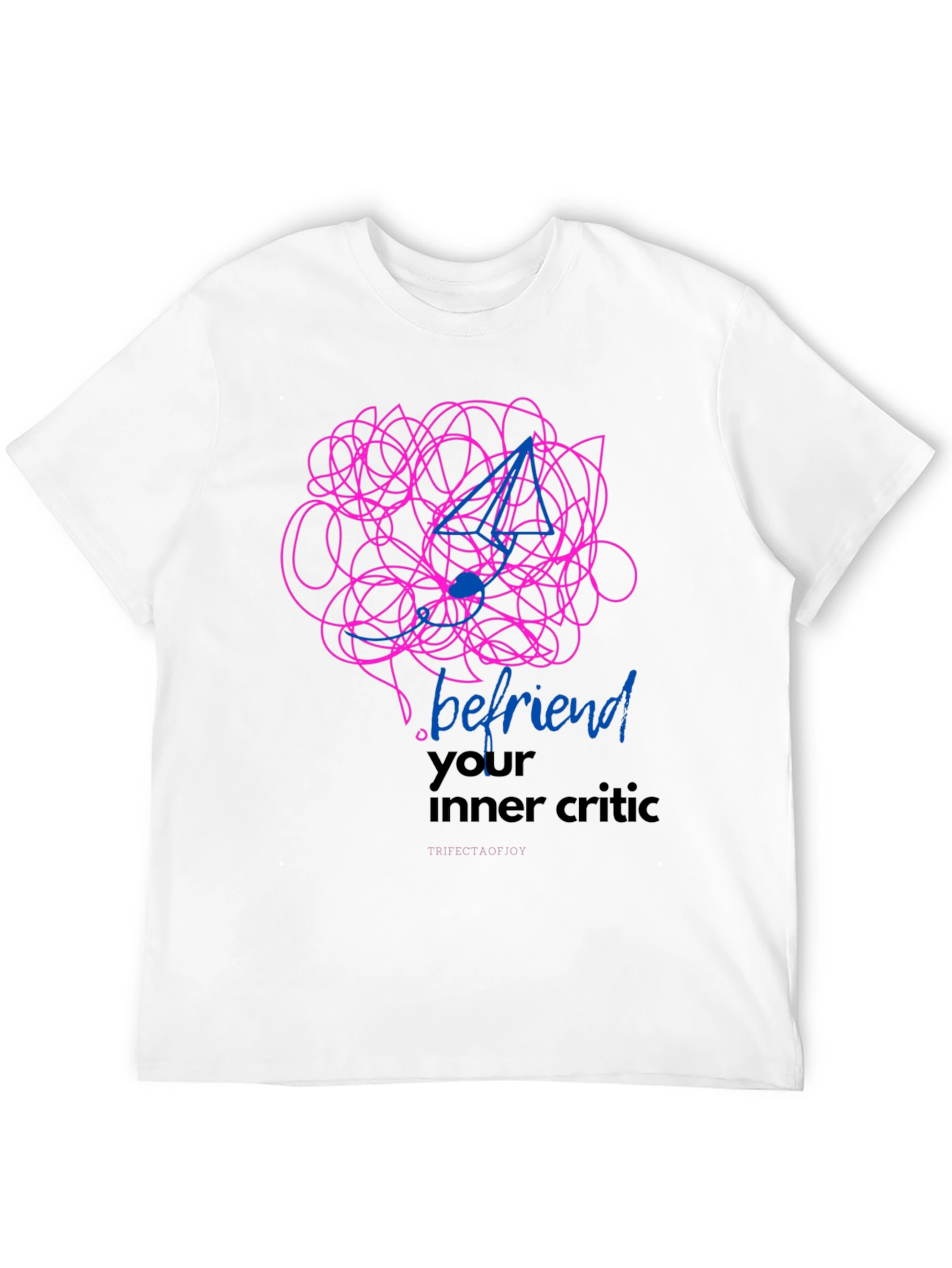 Luce esta llamativa camiseta negra con un diseño artístico único. Presenta un garabato abstracto en tonos fucsia y un diseño geométrico en azul, creando un contraste vibrante y moderno. El mensaje "befriend your inner critic" (hazte amigo de tu crítico interior) añade un toque inspirador y reflexivo. Ideal para expresar tu individualidad y un enfoque positivo. Perfecta para uso diario, salidas casuales o para combinar con tus jeans favoritos. Fabricada con materiales suaves y cómodos, esta camiseta es una declaración de estilo y una invitación a la autoaceptación. ¡Destaca con esta pieza original y lleva contigo un mensaje poderoso!