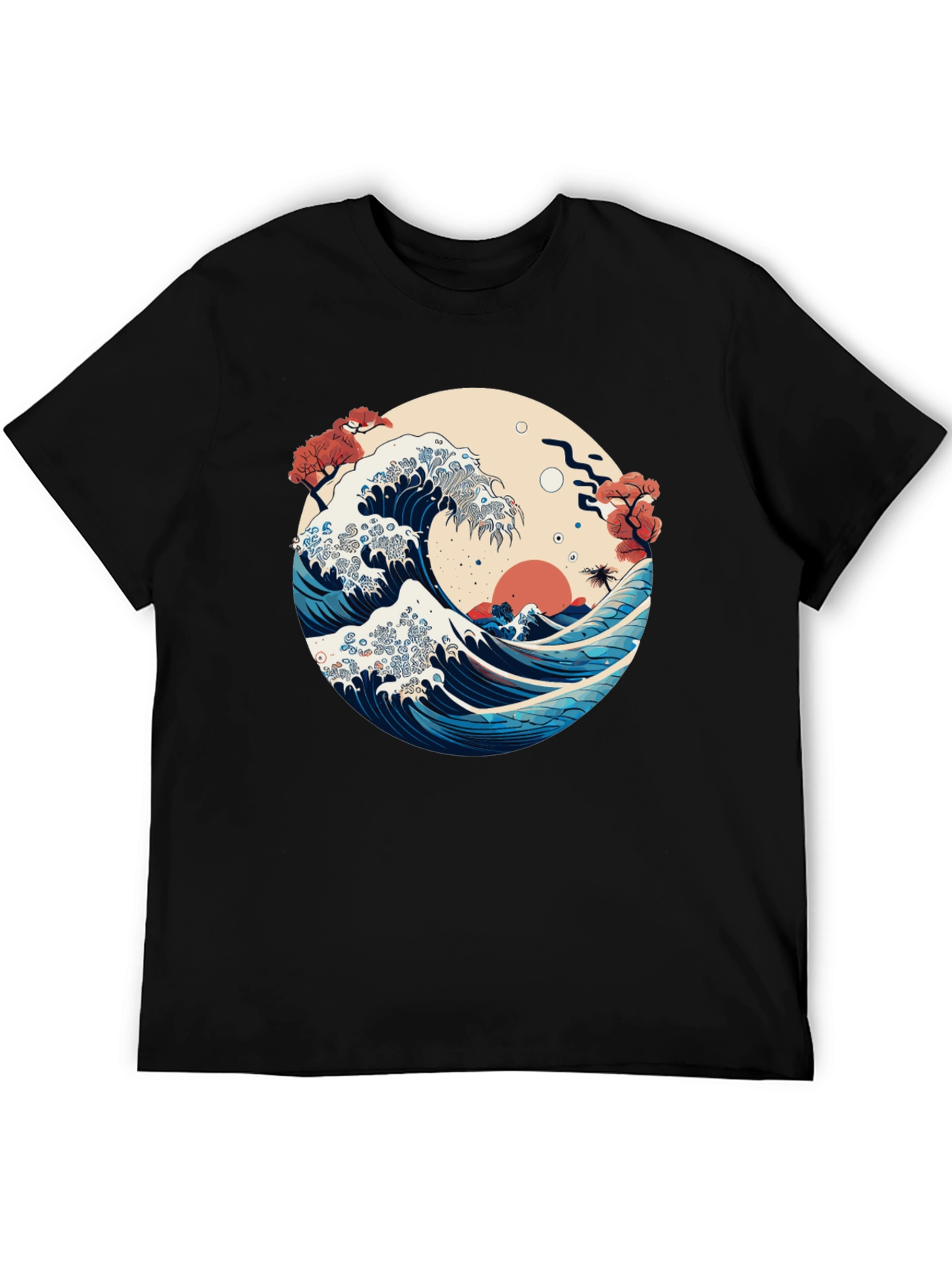 Luce esta llamativa camiseta negra con un diseño circular que evoca el arte tradicional japonés. Presenta una gran ola estilizada en tonos azules y blancos, rodeada de árboles rojizos y un sol naciente. La camiseta parece estar hecha de un material suave y cómodo, ideal para el uso diario. Su diseño único la convierte en una prenda perfecta para expresar tu estilo y tu pasión por la cultura oriental. Combínala con jeans o pantalones casuales para un look relajado y moderno. ¡Atrévete a destacar con esta pieza de arte vestible!