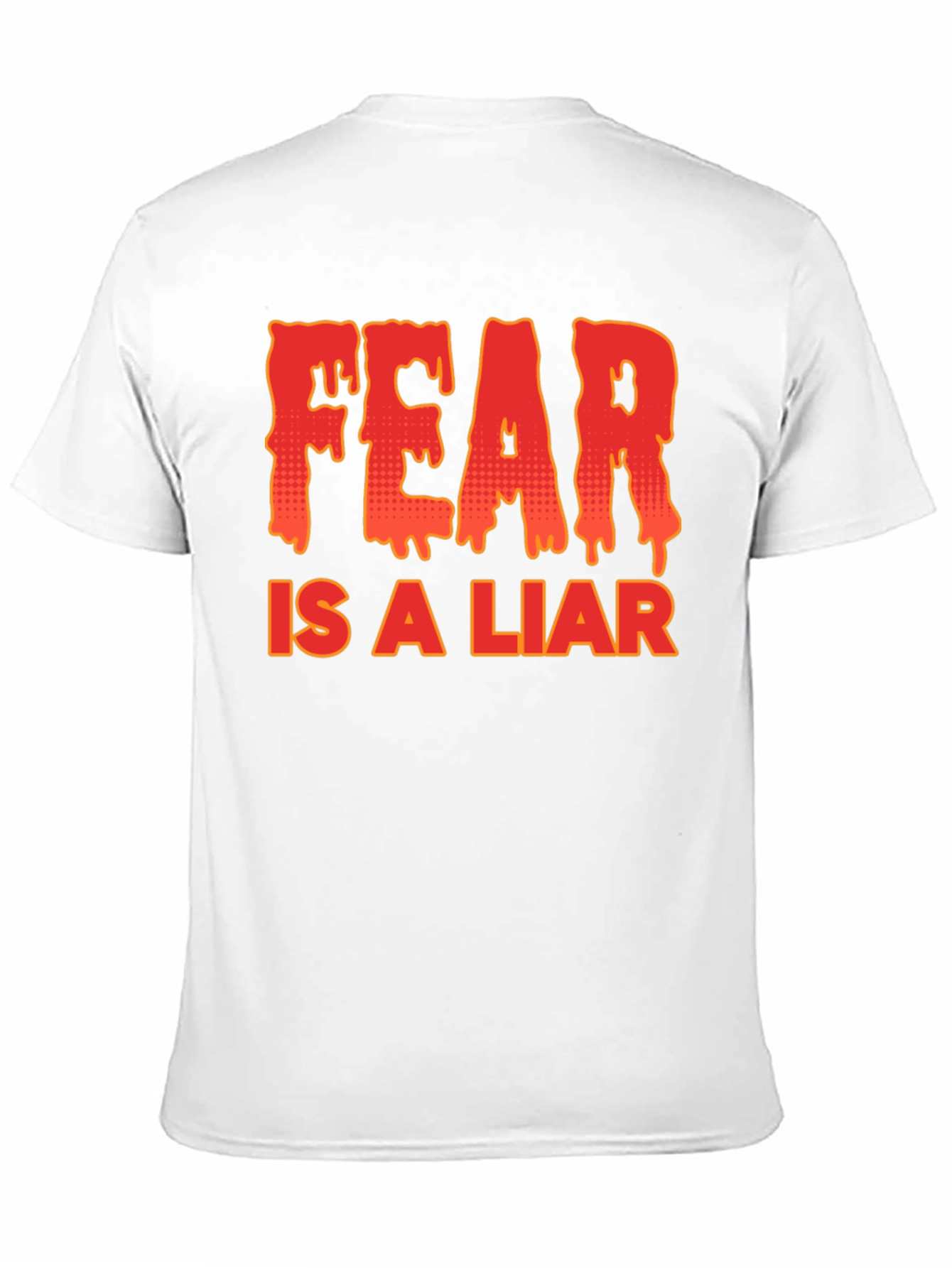 Luce esta llamativa camiseta negra con un diseño impactante. Presenta la frase "FEAR IS A LIAR" (El miedo es un mentiroso) en letras grandes de color rojo vibrante, con un efecto goteo que le da un toque audaz y original. Fabricada en un material suave y cómodo, ideal para el uso diario. Perfecta para expresar tu actitud valiente y decidida. Ideal para combinar con jeans, pantalones casuales o incluso una falda para un look moderno y con personalidad. ¡Deja que tu ropa hable por ti!