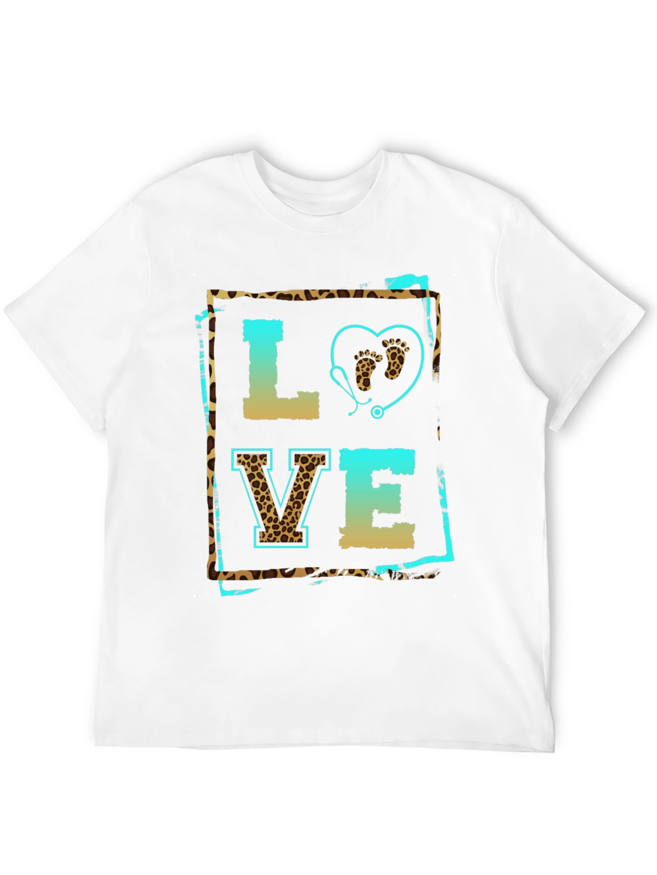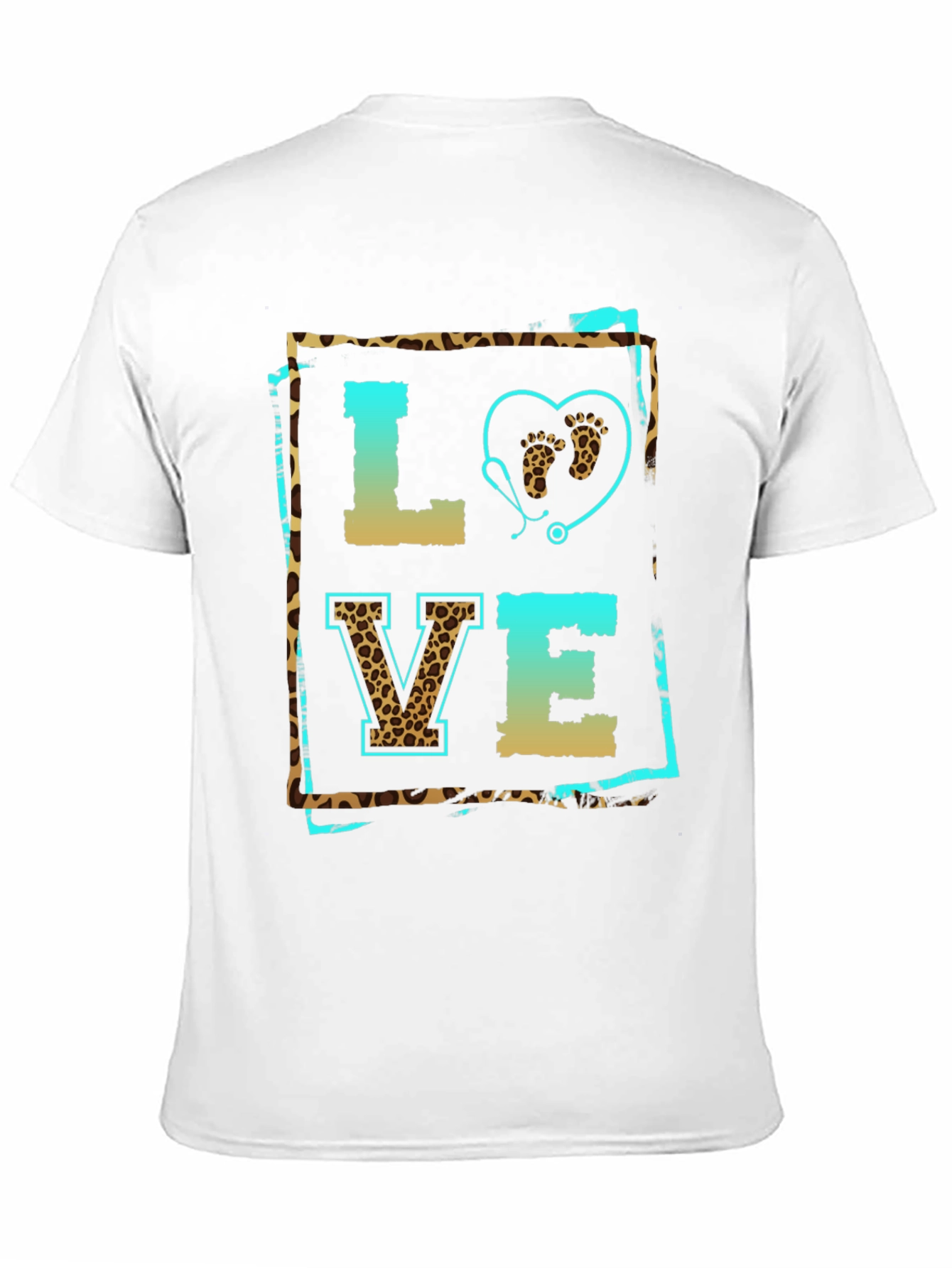 Esta camiseta negra presenta un diseño llamativo con la palabra "LOVE" en estilo gráfico único. La letra "L" y "E" tienen un degradado de color, mientras que la "V" tiene un estampado de leopardo. Un estetoscopio forma el contorno de un corazón en la palabra, simbolizando la profesión de enfermería. El diseño está enmarcado con un borde de estampado de leopardo y detalles en color aguamarina que le dan un toque moderno. Ideal para enfermeras y amantes de la moda, esta camiseta es perfecta para usar en el trabajo, eventos casuales o para mostrar tu pasión por el cuidado de la salud. Una prenda cómoda y con estilo que seguro llamará la atención.