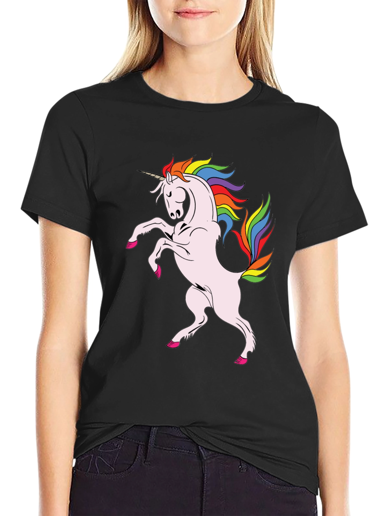 Luce esta llamativa camiseta negra con un diseño único de un unicornio blanco. Su melena y cola están adornadas con los colores del arcoíris, añadiendo un toque de fantasía y originalidad a tu vestuario. Ideal para expresar tu estilo individual y destacar entre la multitud. Perfecta para uso diario, eventos informales o como un regalo especial para los amantes de los unicornios y los diseños creativos. Fabricada con materiales suaves y cómodos para garantizar una experiencia de uso placentera. ¡Atrévete a mostrar tu lado mágico con esta camiseta única!