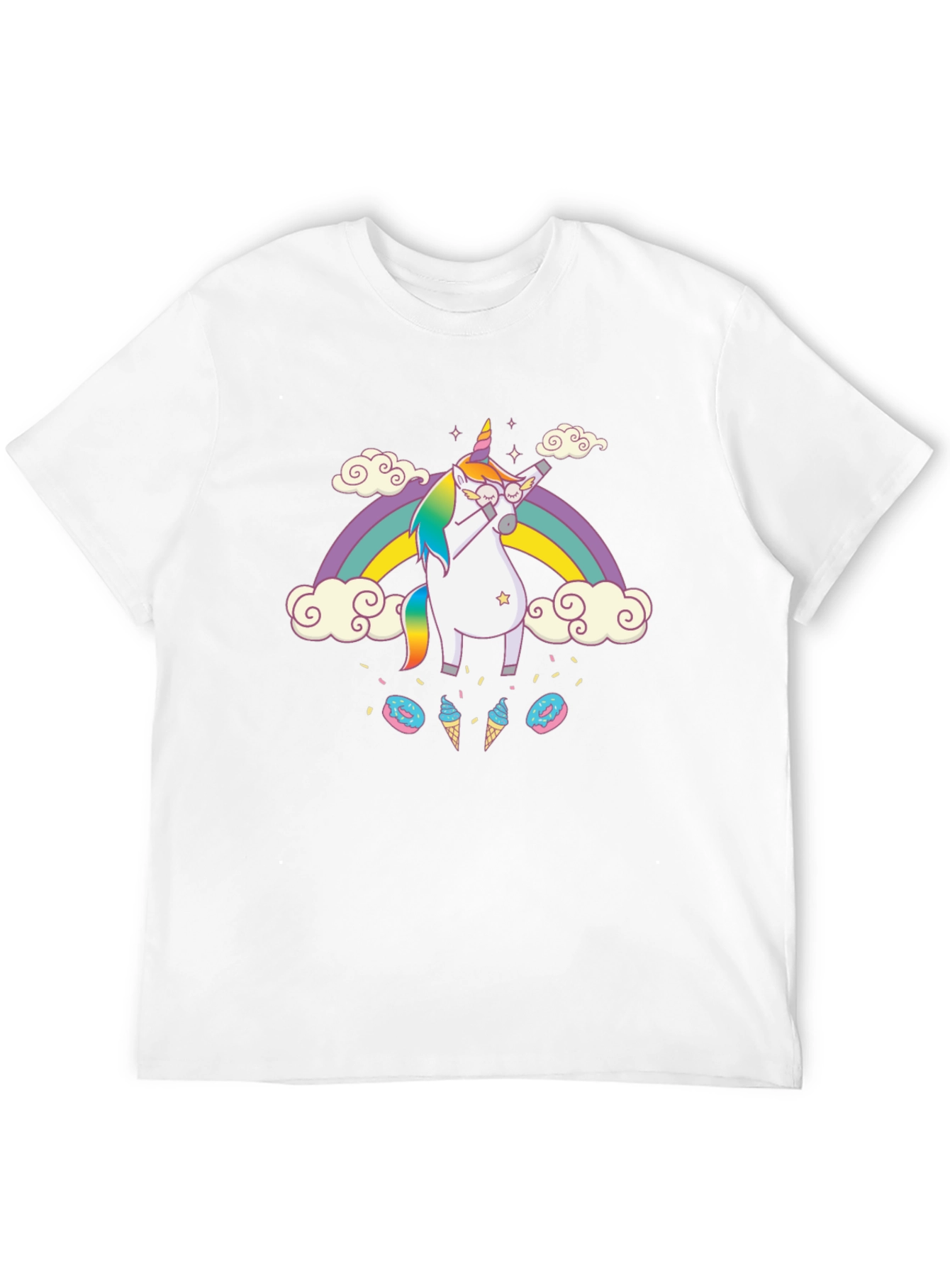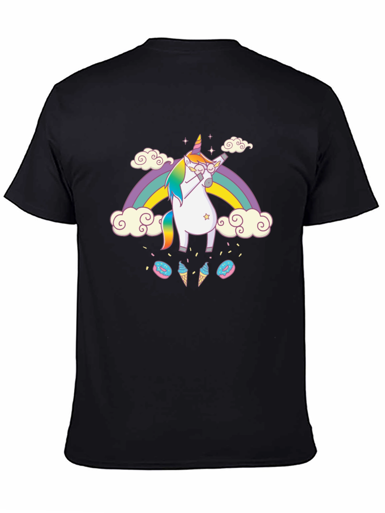 Esta camiseta negra presenta un divertido diseño de un unicornio haciendo el 'dab' frente a un arcoíris y nubes esponjosas. Varios donuts y helados flotan alrededor, añadiendo un toque dulce y alegre. Fabricada con un material suave y cómodo, esta camiseta de manga corta es perfecta para cualquier ocasión casual, desde salir con amigos hasta relajarse en casa. El diseño vibrante y llamativo seguramente atraerá miradas y te hará destacar entre la multitud. Ideal para los amantes de los unicornios y los diseños originales. ¡Añade un toque de magia y diversión a tu armario con esta camiseta única!