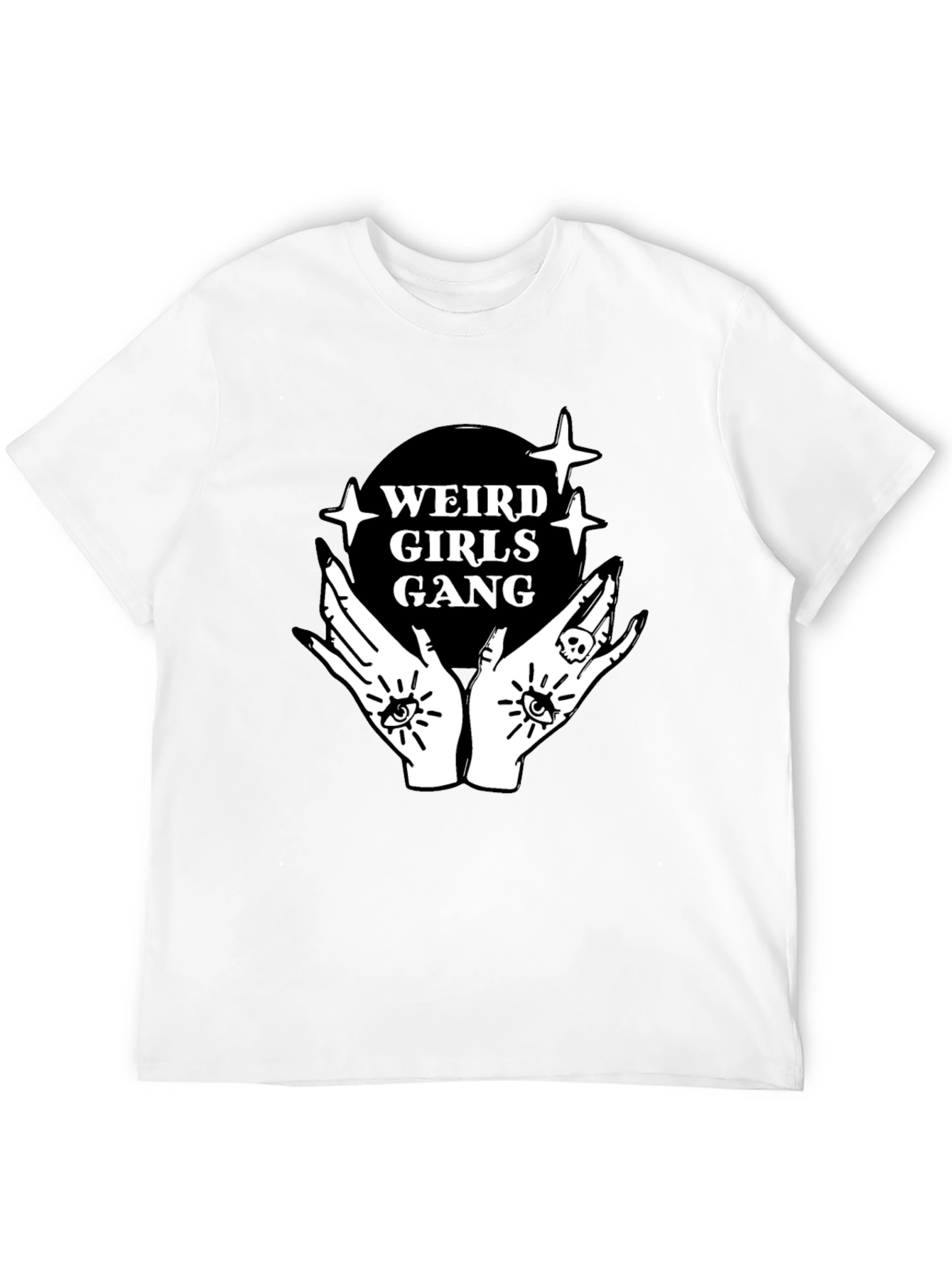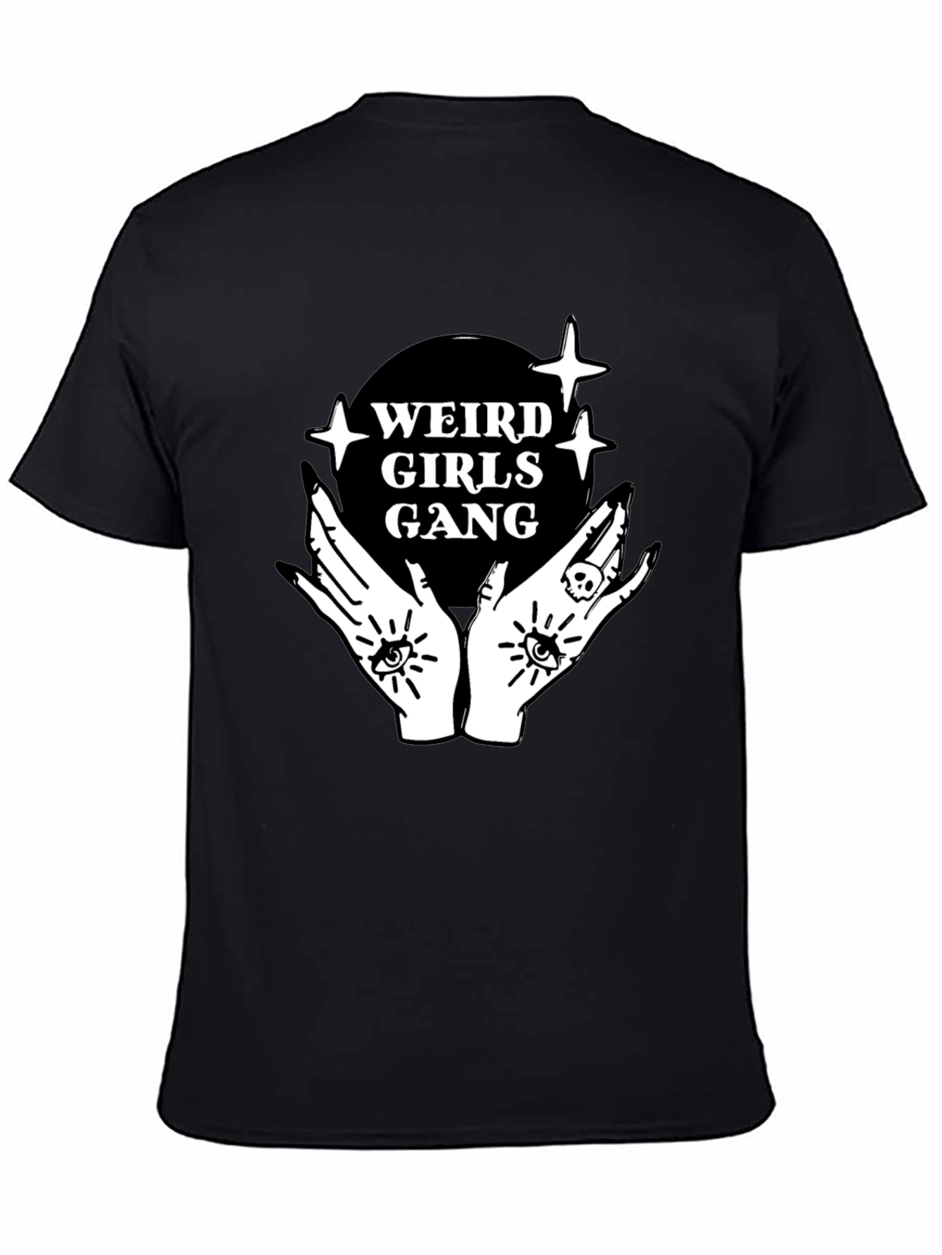 Luce esta camiseta negra con un diseño único y llamativo. En el centro, un gráfico en blanco y negro muestra unas manos sosteniendo una esfera con la leyenda 'Weird Girls Gang', adornada con estrellas. Cada mano exhibe un ojo estilizado y un pequeño cráneo, añadiendo un toque místico y alternativo. Confeccionada con un tejido suave y cómodo, esta camiseta es perfecta para expresar tu individualidad y unirte a la onda 'Weird Girls'. Ideal para un look casual, conciertos, o simplemente para destacar entre la multitud. Su diseño unisex la hace versátil y adaptable a cualquier estilo. ¡Atrévete a mostrar tu lado más original con esta prenda!