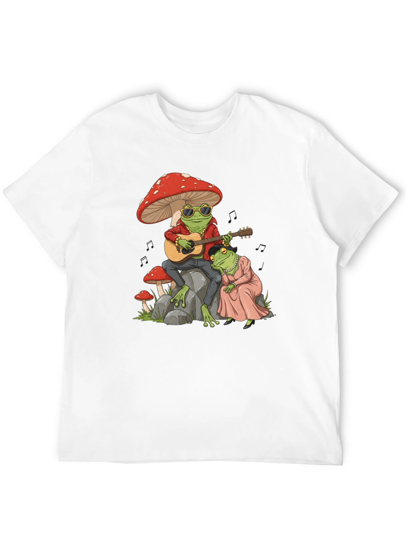Luce esta original camiseta negra con un diseño divertido y creativo. Muestra una rana tocando la guitarra sentada sobre una roca, bajo una gran seta roja con lunares blancos. Otra rana, vestida con un elegante vestido rosa y collar de perlas, escucha atentamente. Perfecta para amantes de la música, la naturaleza y los diseños únicos. Ideal para llevar en conciertos, festivales o simplemente para expresar tu personalidad. Fabricada con materiales suaves y cómodos, esta camiseta te brindará estilo y confort en cada uso. Destaca entre la multitud con esta prenda llamativa y llena de vida. ¡Consigue la tuya y marca la diferencia!