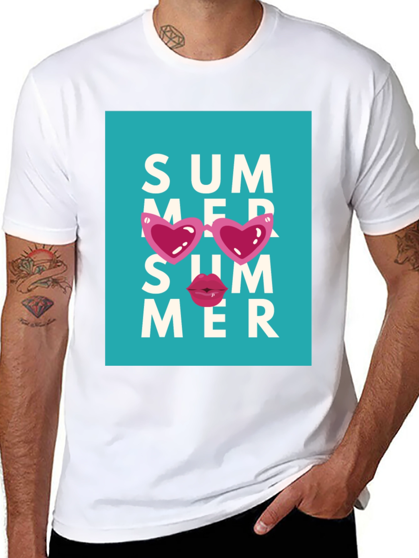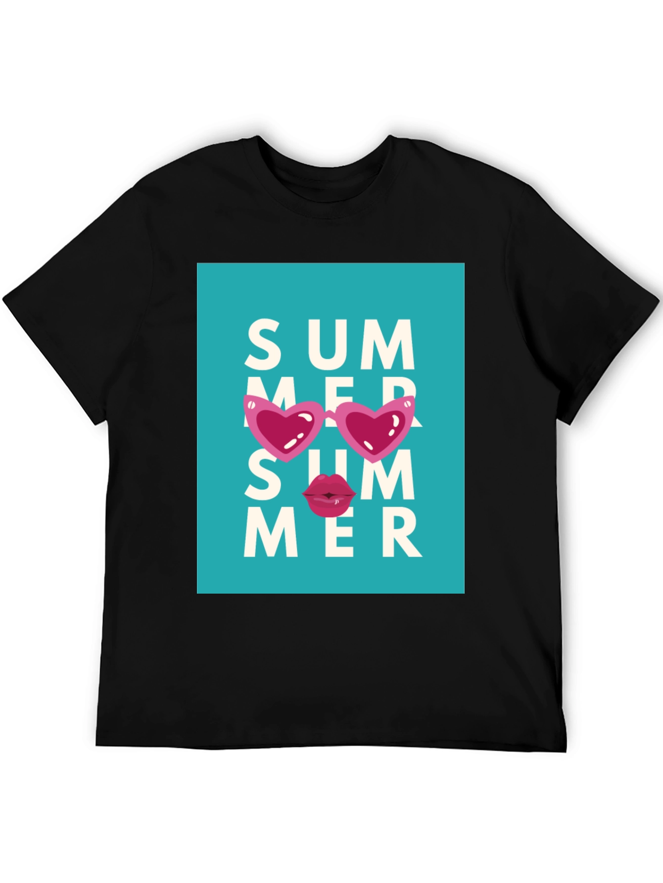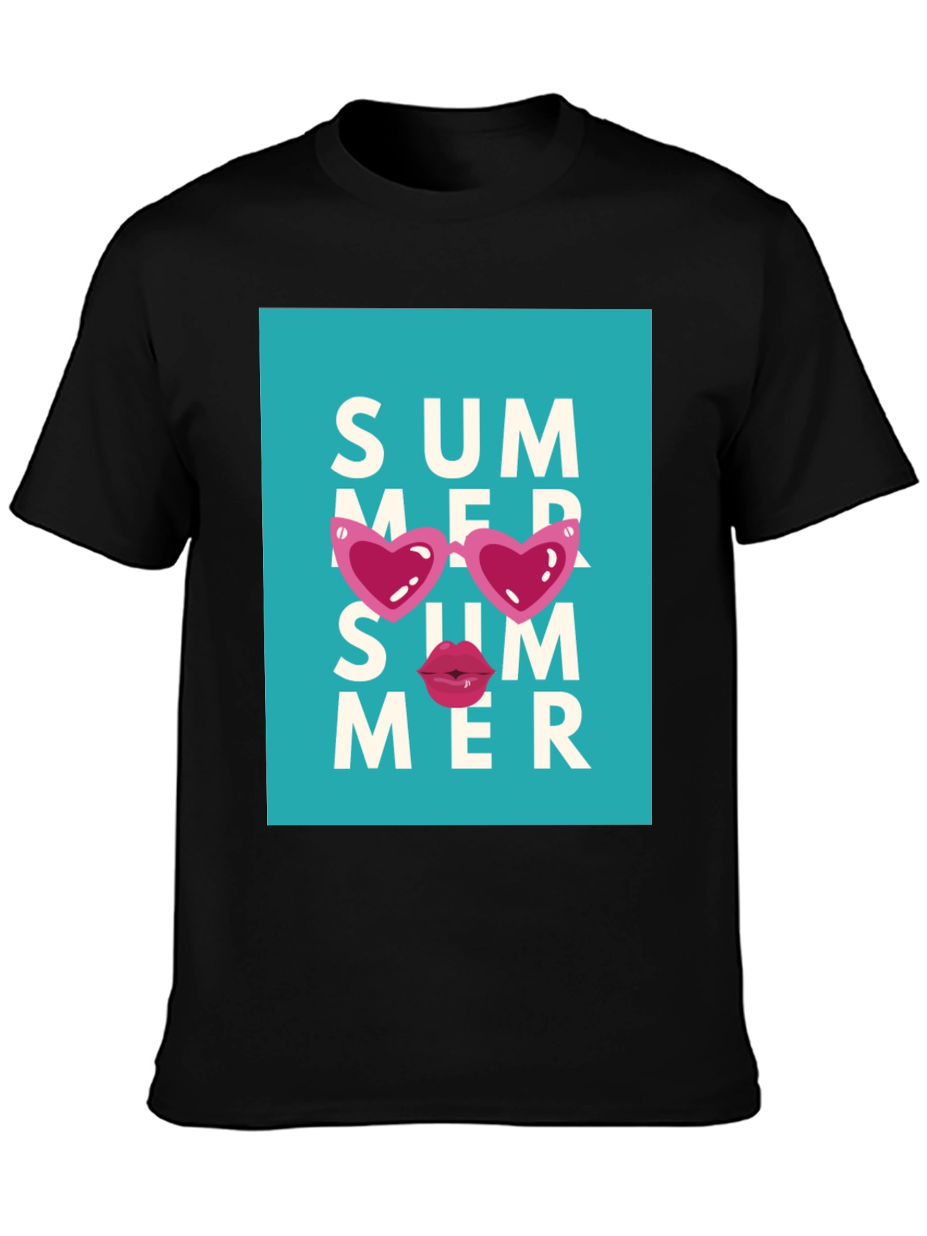 Prepárate para el verano con esta camiseta negra de diseño único. La prenda presenta un estampado llamativo con la palabra "SUMMER" en letras blancas, adornada con gafas de sol en forma de corazón y unos labios rosados. Ideal para un look casual y moderno, perfecta para llevar en la playa, de paseo o en cualquier ocasión veraniega. El tejido parece suave y cómodo, ideal para los días cálidos. Dale un toque divertido y original a tu armario con esta camiseta que celebra la temporada más alegre del año. ¡No te quedes sin la tuya!